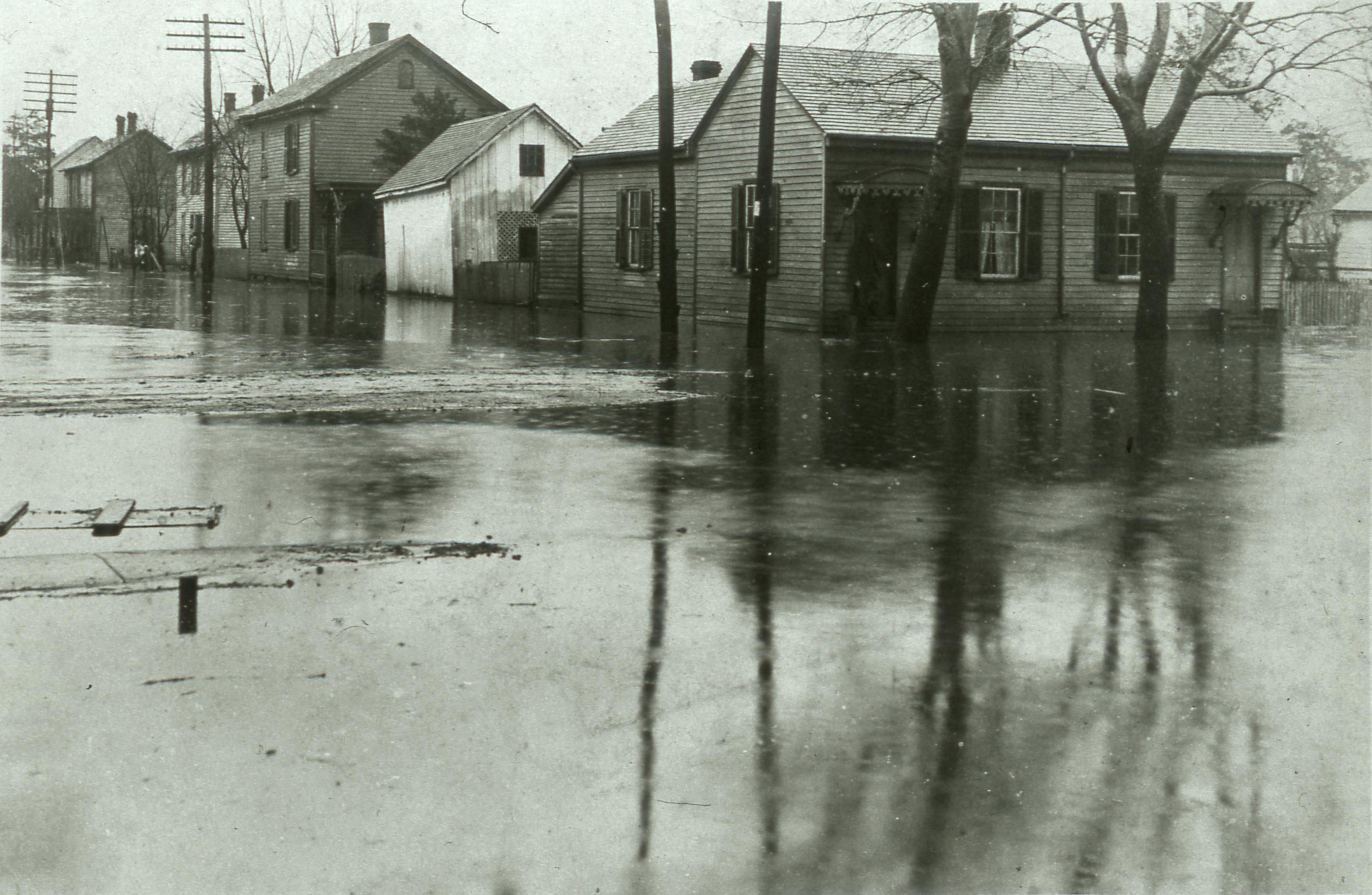 Historic Photo. Streets Collection: 1913 Flood: On March 24 and 25 of 1913 the Wabash River had produced a large flood, which inundated the town of New Harmony, from torrential rains and storms which had also produced tornados across the mid-west United States. At its height it measured 27 feet 10 inches. Corner of Main and Steam Mill Streets facing east down Steam Mill.