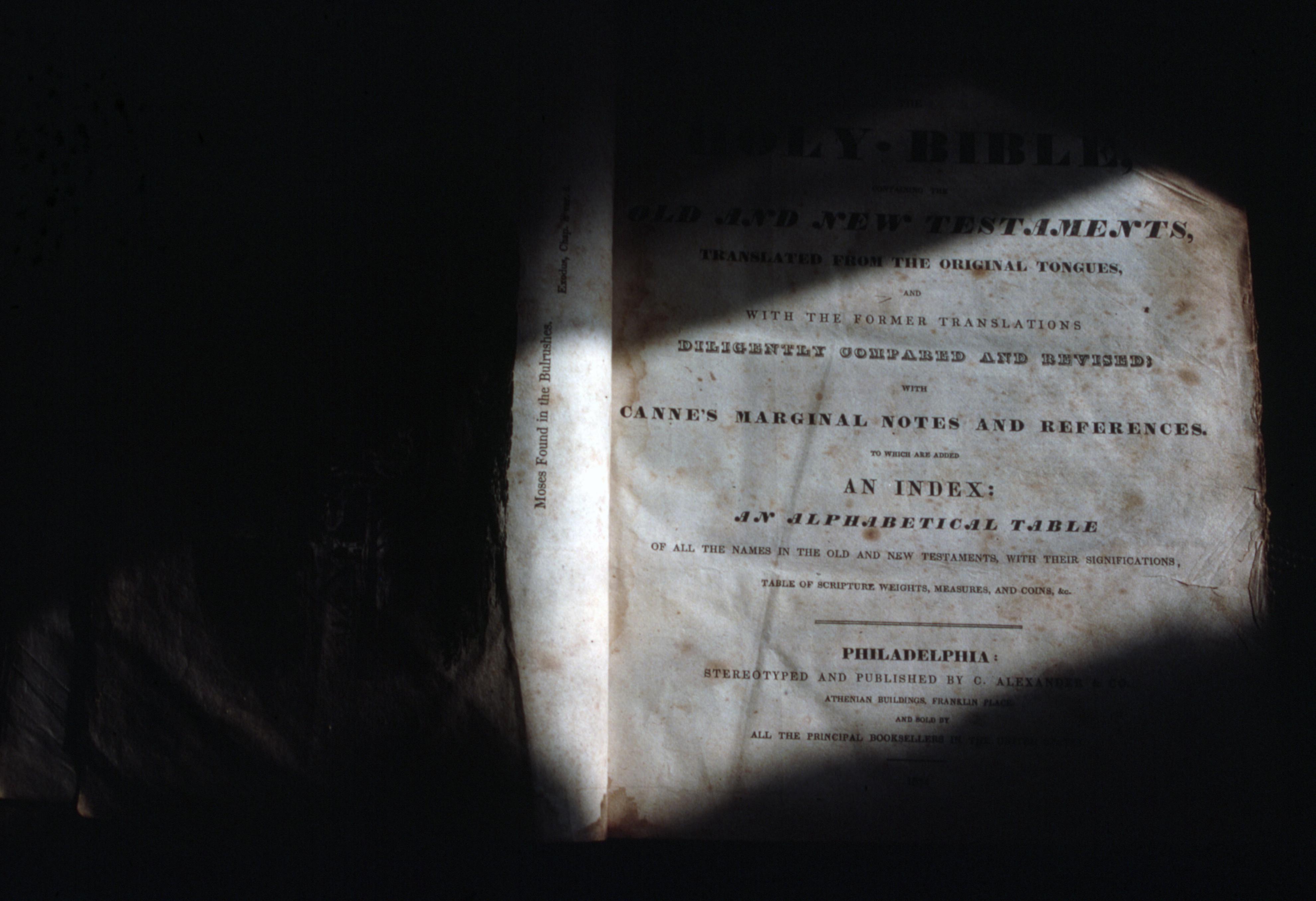 The Jaquess House: This is a photo of the Jaquess House, from which the parlor was taken, was moved from somewhere near Poseyville. It was then taken through a field to near the edge of a highway where it was dismantled. The parlor was then incorporated into the Owen House on the corner of Tavern and Brewery Streets in town block 6 E east. This is a photo of a Bible which is dated to 1834.