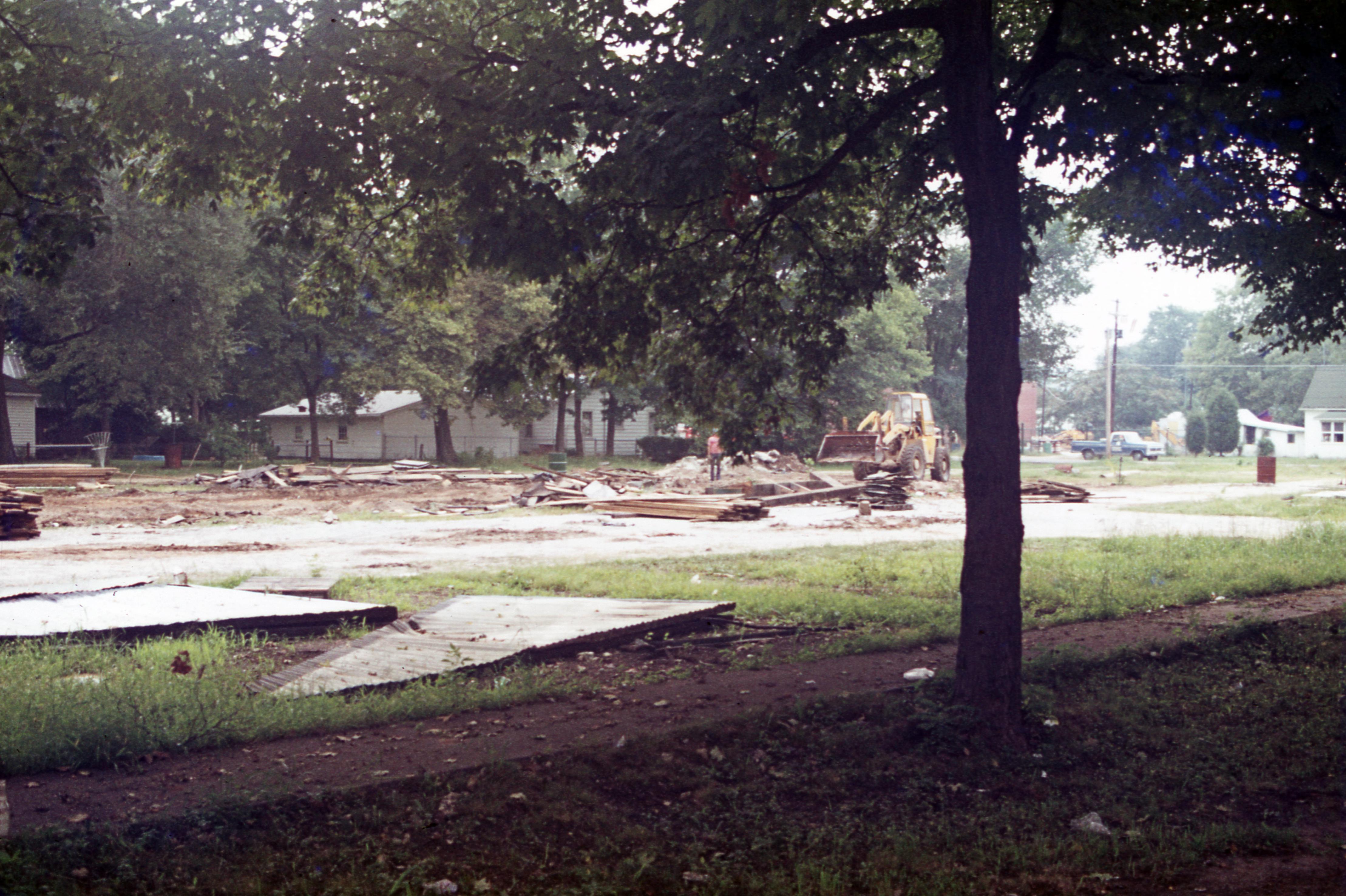 Continental Emsco Company: This building was located on the plat just west of 723 E. Church Street and was dismantled to accommodate the Golden House which was later moved onto this plat. The Continental Emsco Company was incorporated June 4, 1946 in the state of Texas, and dissolution of the company occurred January 31, 1984. The company was in the business of drilling oil wells. In this photo there very little left of the old building and construction workers are beginning to clear rubble and level the plat.