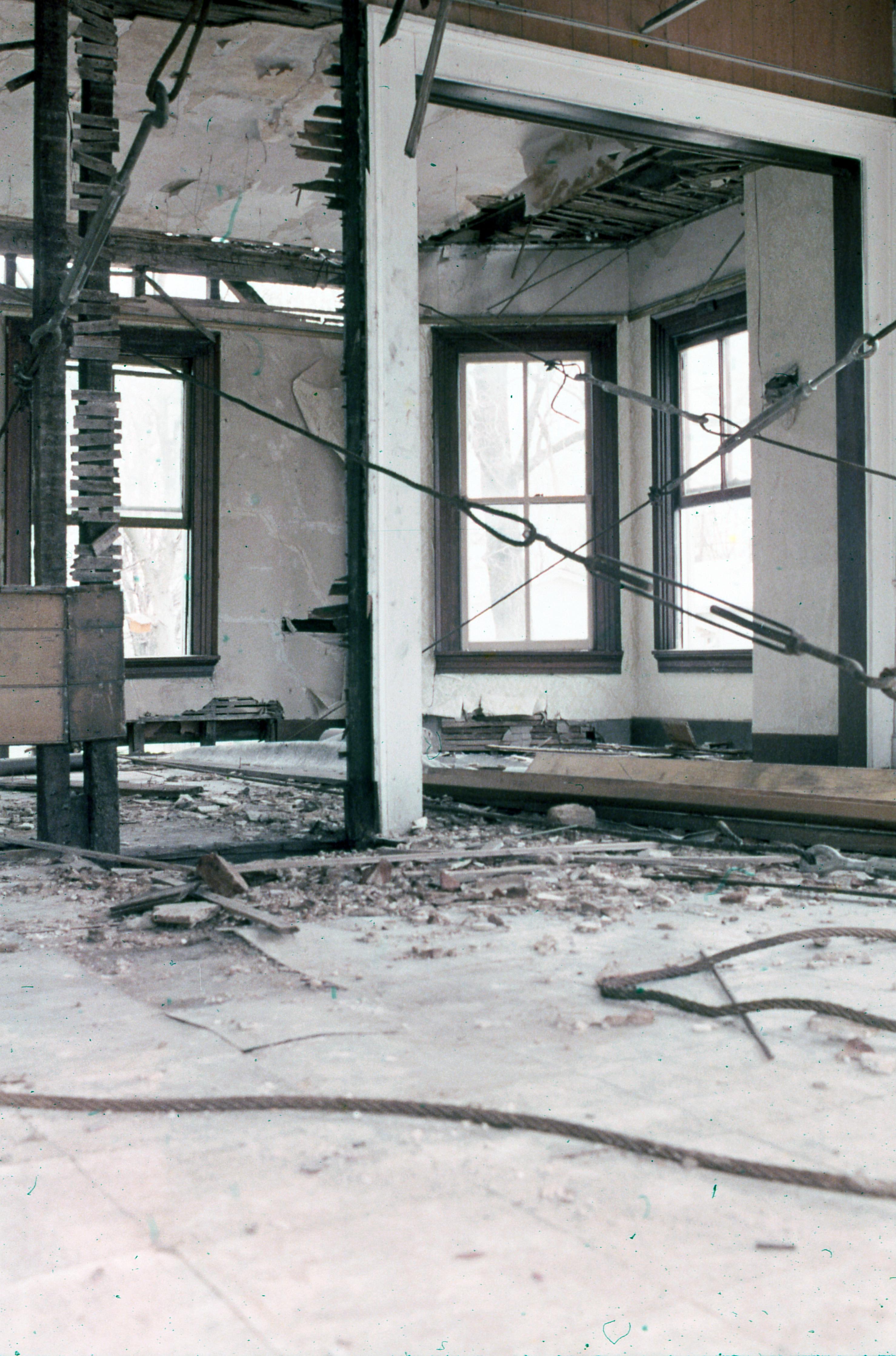 Golden House: This building was moved from the plat of 807 Church, what is now 811 Church Street, to one plat west of 723 E. Church Street but has since been demolished, most likely when the house at 707 E. Church was built in 2009. Elmer Buchta Moving Engineers was contracted for this and many other building moves during the 1970s. This photo shows the inside of the Golden House before restoration work was started.