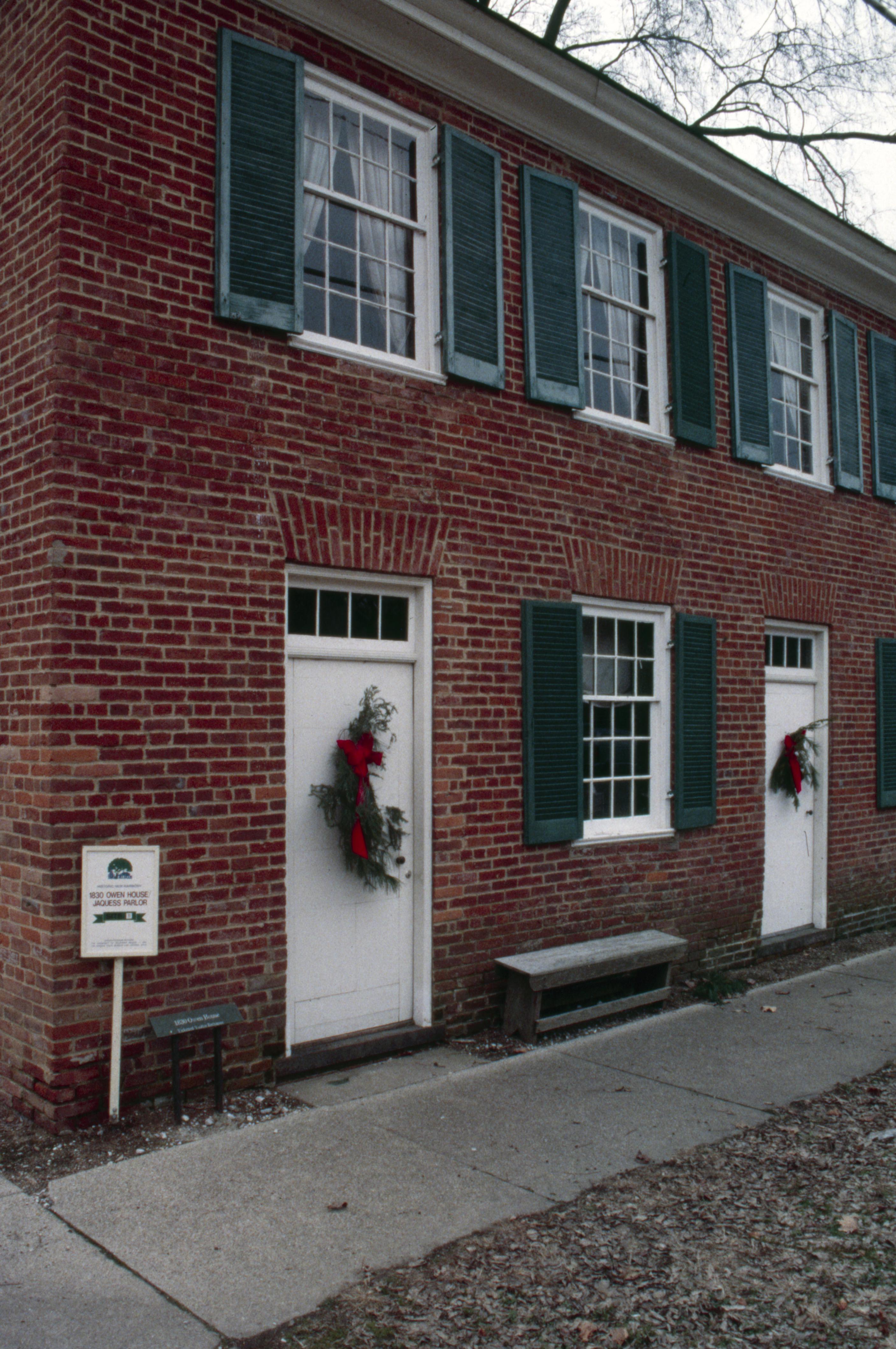 1830 Owen House: Located at 531 Tavern Street. The east end of the 1830 Owen House decorated for Christmas. The posted sign, from Historic New Harmony, states this is Site 11 the 1830 Owen House and Jaquess Parlor.