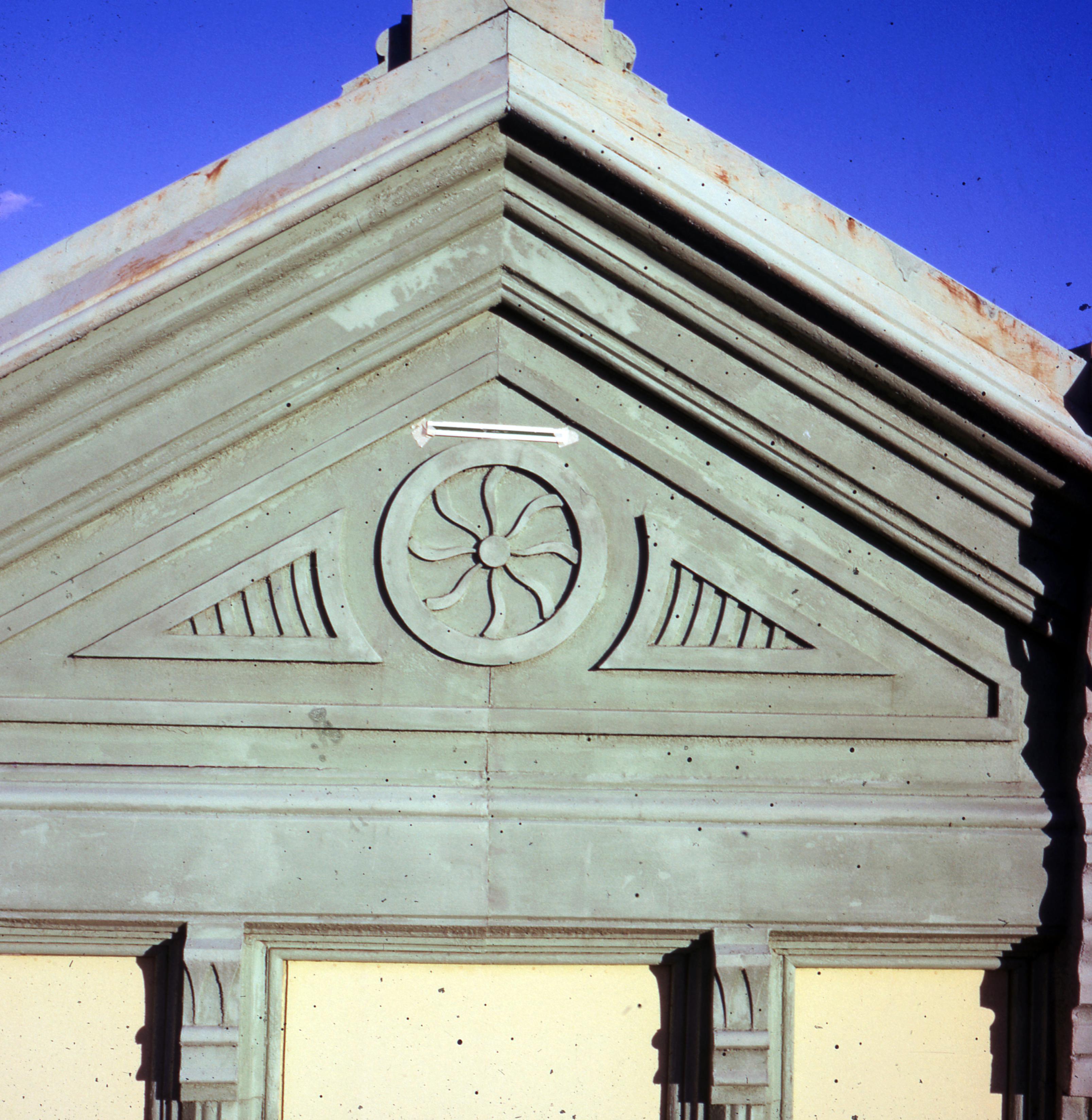 The Owen Building: This building is located at 504 Main Street and was once the right side of 502 Main Street. The two buildings combined have a long history, being built before 1888. They were the location of E. F. Owen and Company�s store, this side being the hardware shop at least until 1907 or later. New Harmony Gallery of Contemporary Art now located in both 504 and 506 Main Street with 506 being used as a sales floor. The art gallery, opened in the fall of 1975, after the building went through refurbishment and is still a part of the University of Southern Indiana today (2021). The gallery is a not-for-profit space for artists to hold exhibitions of their work with a sales floor in the adjoining building at 506 Main. This photo shows the stonework in the gable on the building after it had been cleaned.