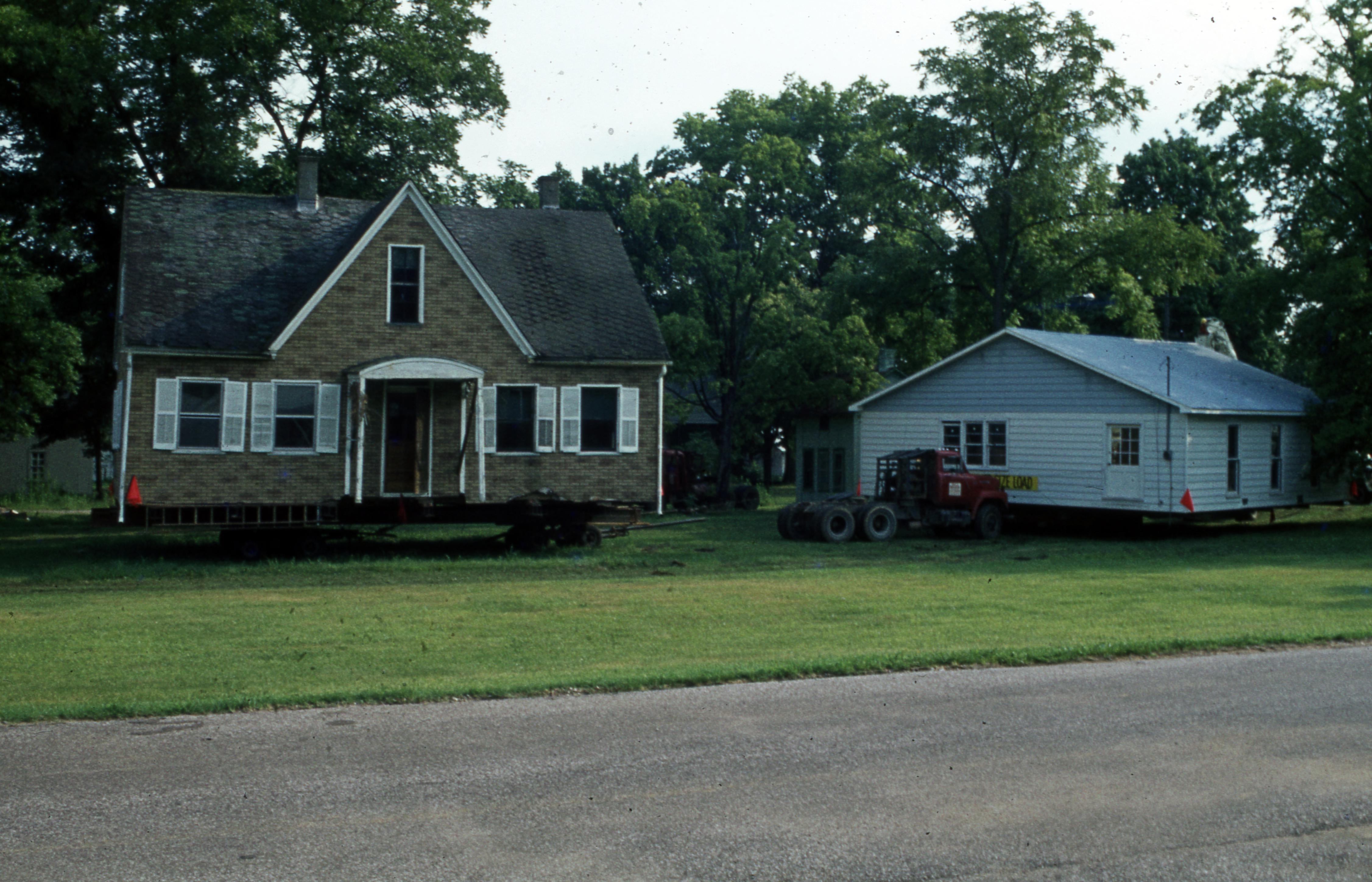 Beal House: The Beal House was moved during the Lanark Construction, on Town Block 8 E/W on Main Street to 611 Church Street. The Beal house was constructed around 1829 by John Beal, who was a carpenter in the Owen and Maclure community. Beal constructed the house from lumber and timbers from an older horse barn. The new location would be the site of the Beal House and 1850s Doctor's Office (The Doctor's Office was a remodel of the Kemmerling House, which was also moved to this site). Elmer Buchta Moving Engineers was contracted for this and many other building moves during the 1970s. This photo shows two of the buildings which were moved from town block 8 - E to other locations. From the left: The Beal House, and the Smith Shop.
