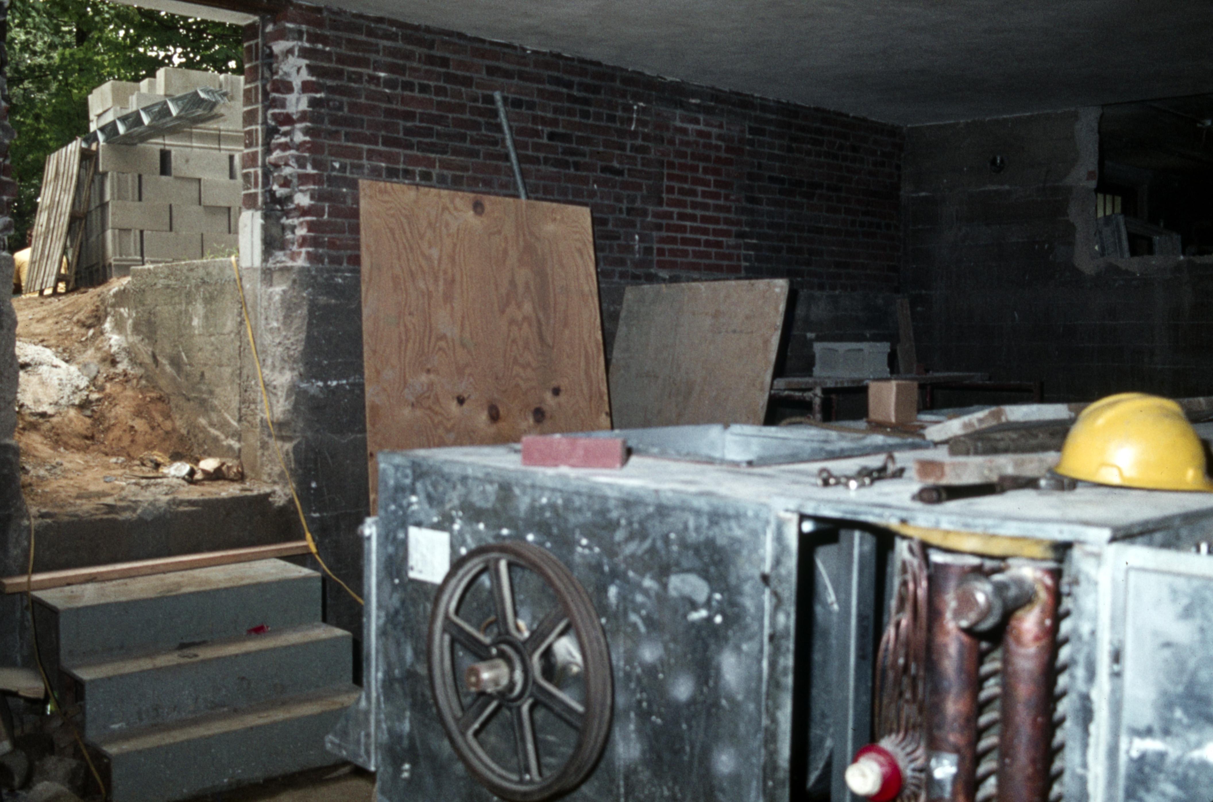 Murphy Auditorium: Murphy Auditorium is located at 419 Tavern Street and was constructed on the plat just east of the Working Men's Institute from 1911 to 1913, using the Doctor Edward Murphy Fund, and was built as part of New Harmony's centennial celebration of 1914. In 2014, the town's bicentennial, Murphy Auditorium became the new home of the concert series Under The Beams, originally housed in the Rapp-Owen Granary. Today, the auditorium is owned by the University of Southern Indiana and is the home of The New Harmony Theater with a seating capacity of 360 people. This is a photo of a basement entrance on the side of the building.