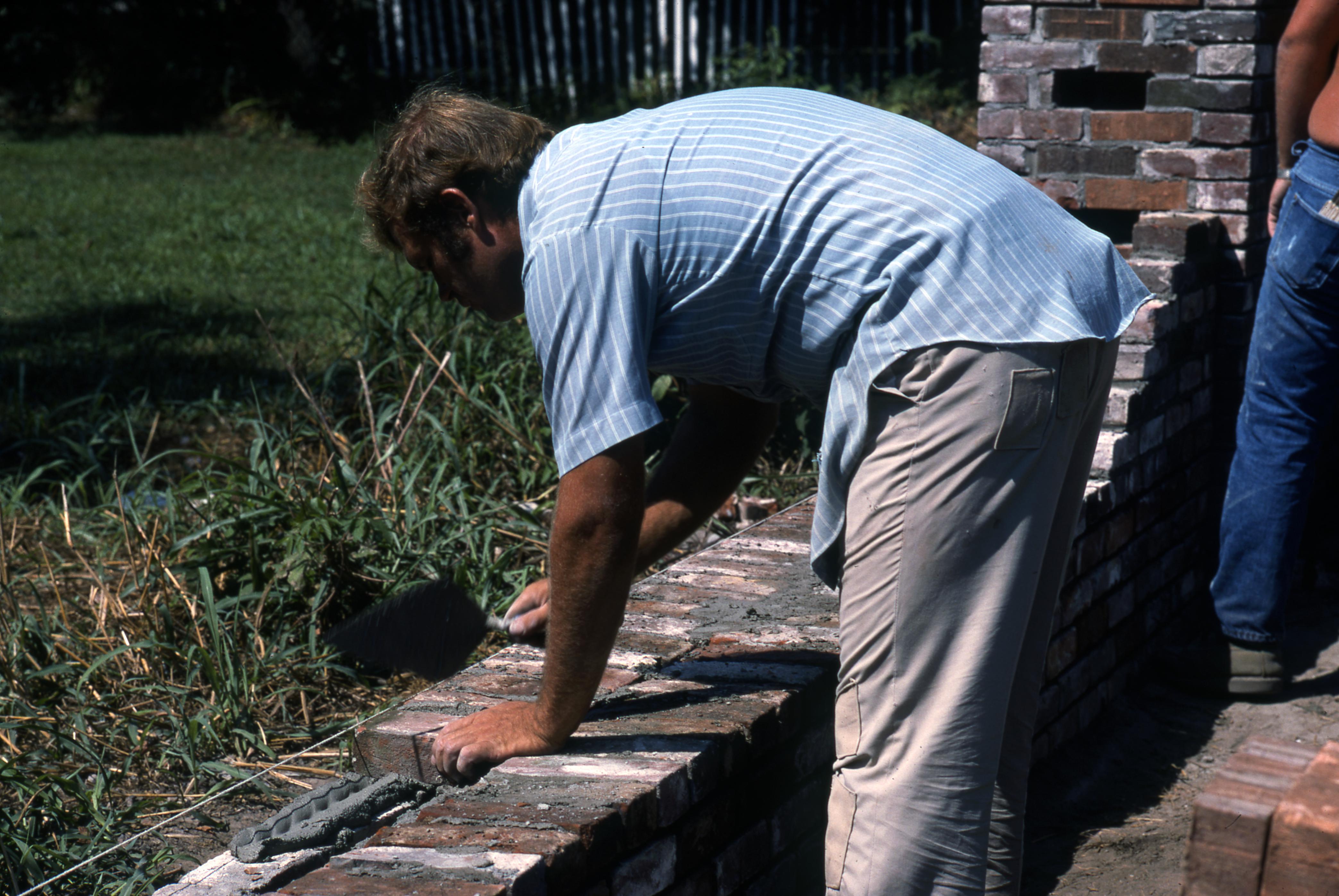 The repairing of the brick wall surrounding the cemetery. The Harmonist Cemetery located at the end of Granary and West Street. The cemetery was originally located in part of the Harmonist orchard and was fenced in with a brick wall in 1874. Located within the wall are at least 20 Middle Woodland Period mounds most likely of the Hopewell people. The property is maintained by the Indiana State Museum and Historic Sites.