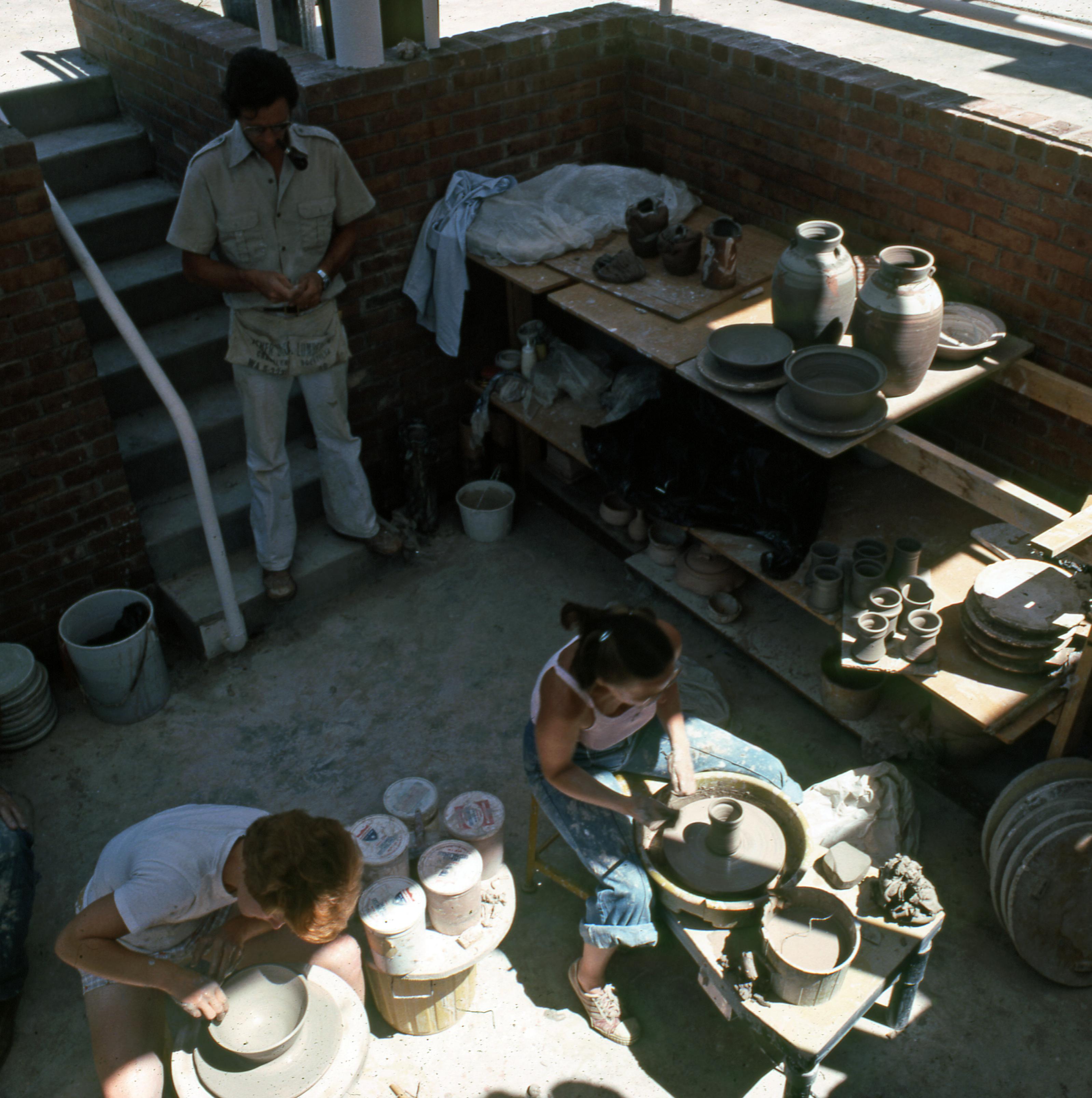 Pottery class working inside the Sarah Campbell Blaffer Potter�s Cabin. The cabin was constructed by Jane Blaffer Owen in honor of her mother, Sarah Campbell Blaffer. The cabin is located at 402.