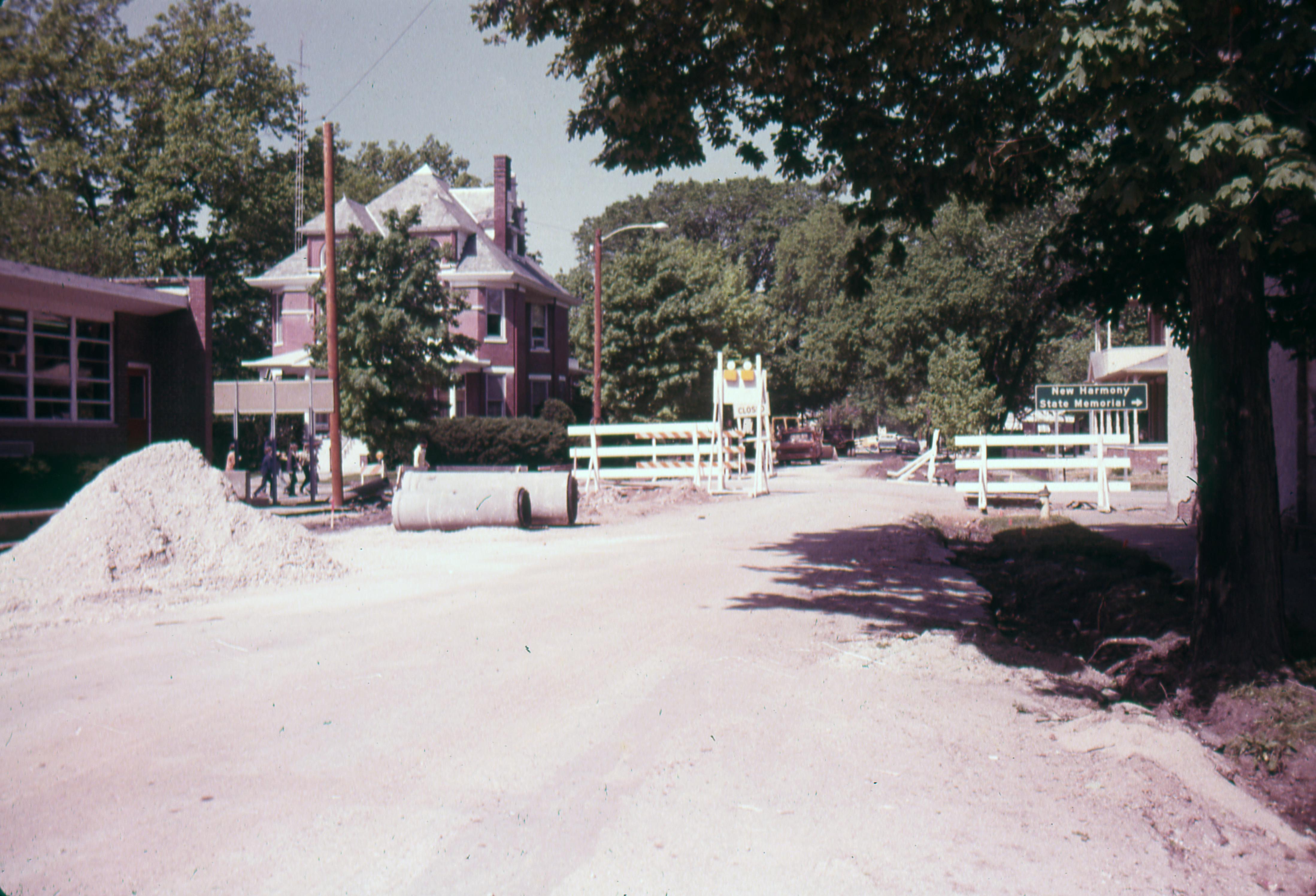 Streets: Church Street at the corner with West Street during the road replacement. Note the old New Harmony School building on the far left side of the photo.