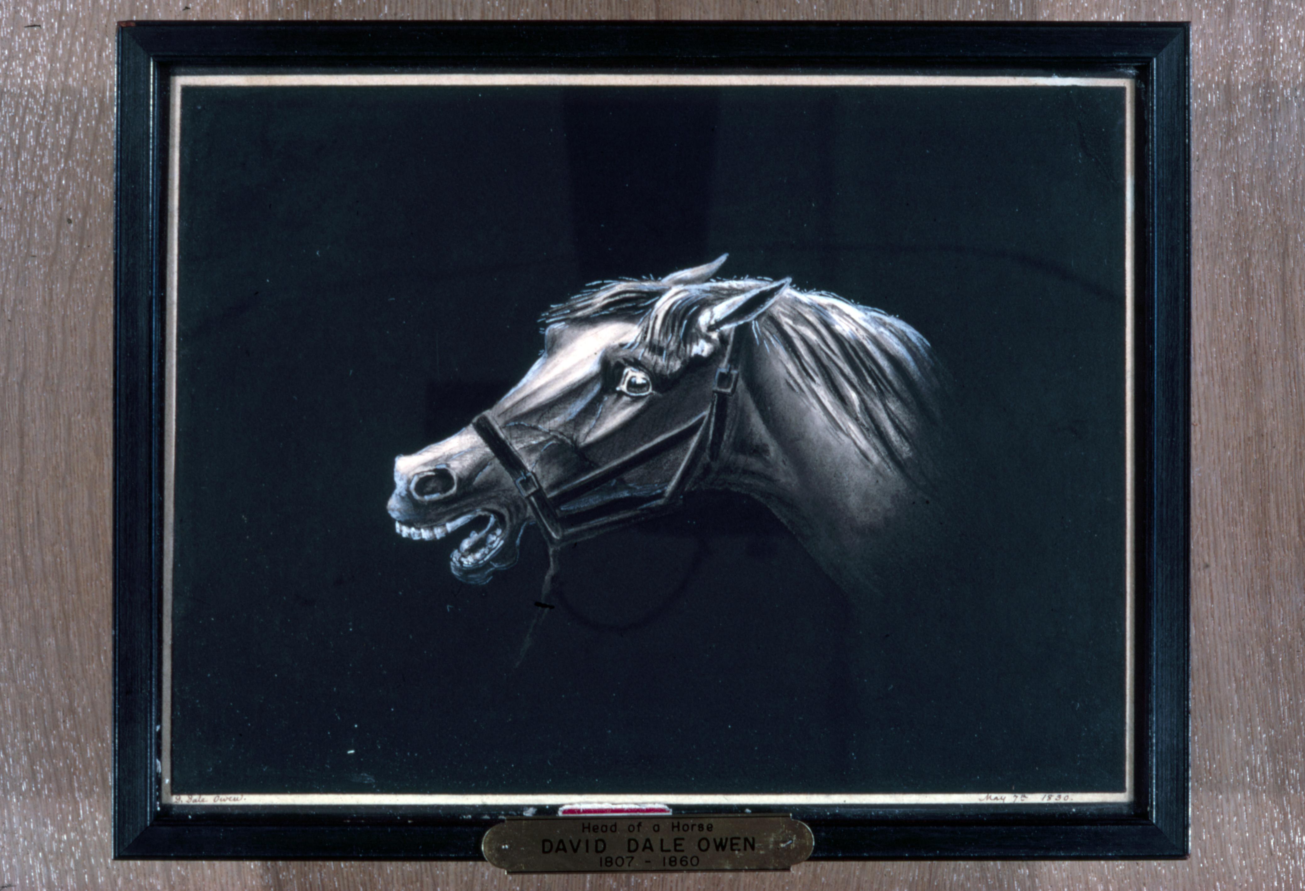 Working Men's Institute: This building is located 407 Tavern Street. The Working Men's Institute was founded in 1838, by William Maclure, as a library for working people, not just those who were wealthy. Initially there were a total of 160 Working Men's Institutes, 144 in the state of Indiana and 16 in the state of Illinois, however, the one in New Harmony Indiana is the only one which still remains. The present location of the WMI was completed in 1894, now a National Historic Landmark, before this it was housed in the old Harmonist Church from 1834 until the new building was completed. The WMI also houses a museum as well as the oldest working library in the state of Indiana. This photo is of ""Head of A Horse"" by David Dale Owen, housed at the WMI.