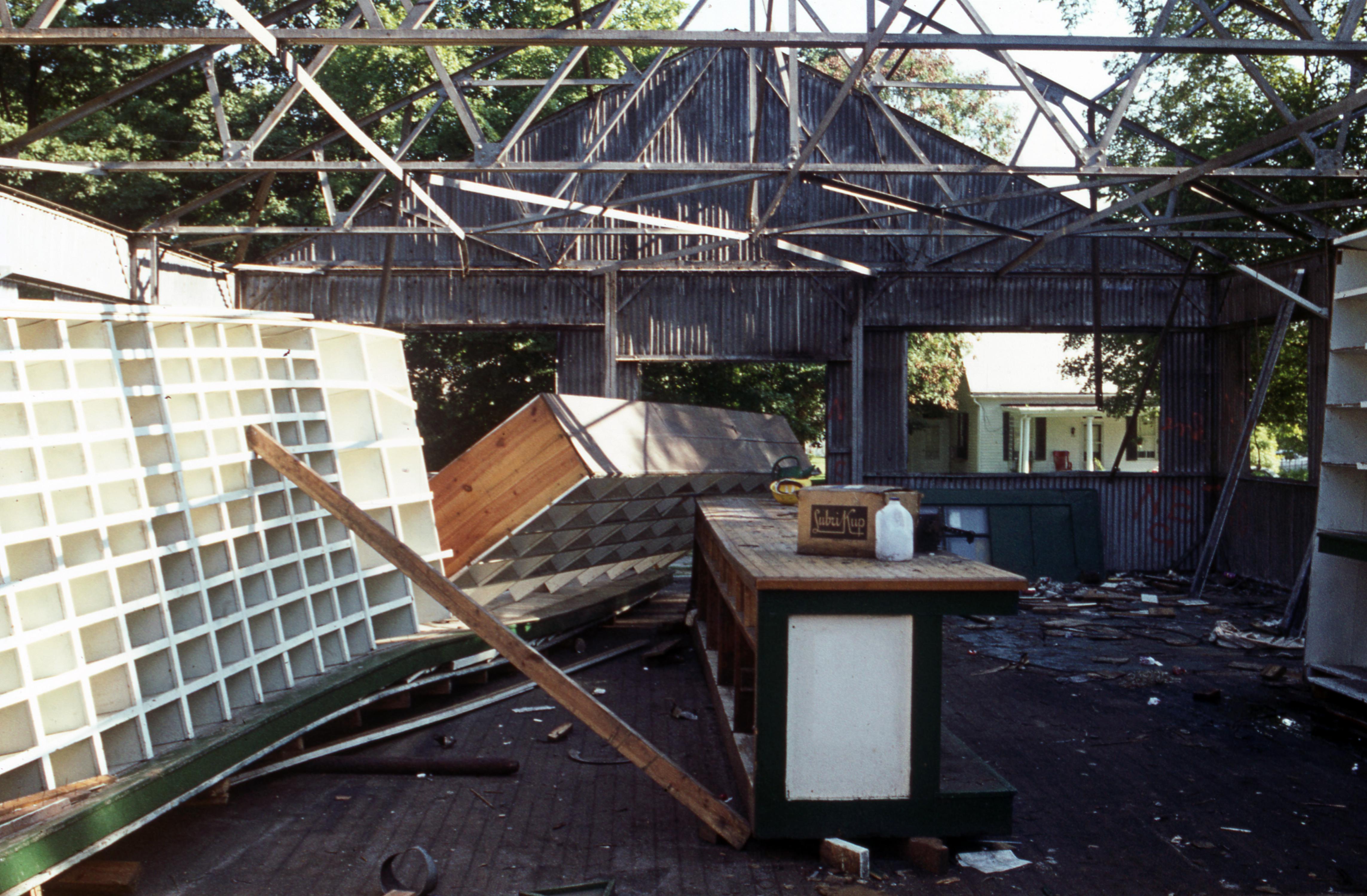 Continental Emsco Company: This building was located on the plat just west of 723 E. Church Street and was dismantled to accommodate the Golden House which was later moved onto this plat. The Continental Emsco Company was incorporated June 4, 1946 in the state of Texas, and dissolution of the company occurred January 31, 1984. The company was in the business of drilling oil wells. This photo shows the inside of the building as it was being dismantled. The old patron counter can be seen in the center of the photo and shelves which held drilling tools can be seen on either side of the photo.