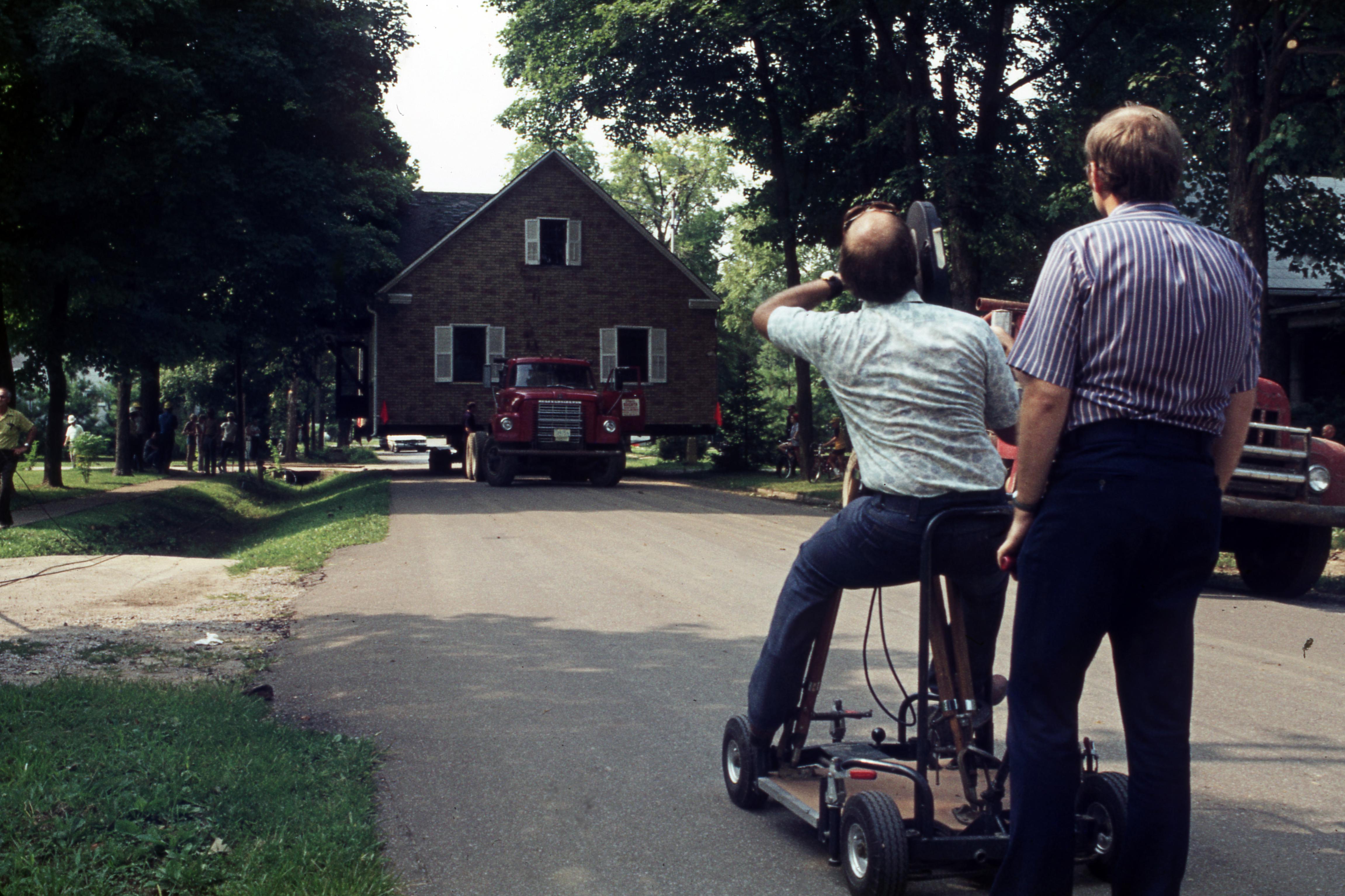 Beal House: The Beal House was moved during the Lanark Construction, on Town Block 8 E/W on Main Street to 611 Church Street. The Beal house was constructed around 1829 by John Beal, who was a carpenter in the Owen and Maclure community. Beal constructed the house from lumber and timbers from an older horse barn. The new location would be the site of the Beal House and 1850s Doctor's Office (The Doctor's Office was a remodel of the Kemmerling House, which was also moved to this site). Elmer Buchta Moving Engineers was contracted for this and many other building moves during the 1970s. In this photo the house is headed north on Brewery Street toward the new plat on Church Street. At this point it was in front of the house at 815 Brewery.