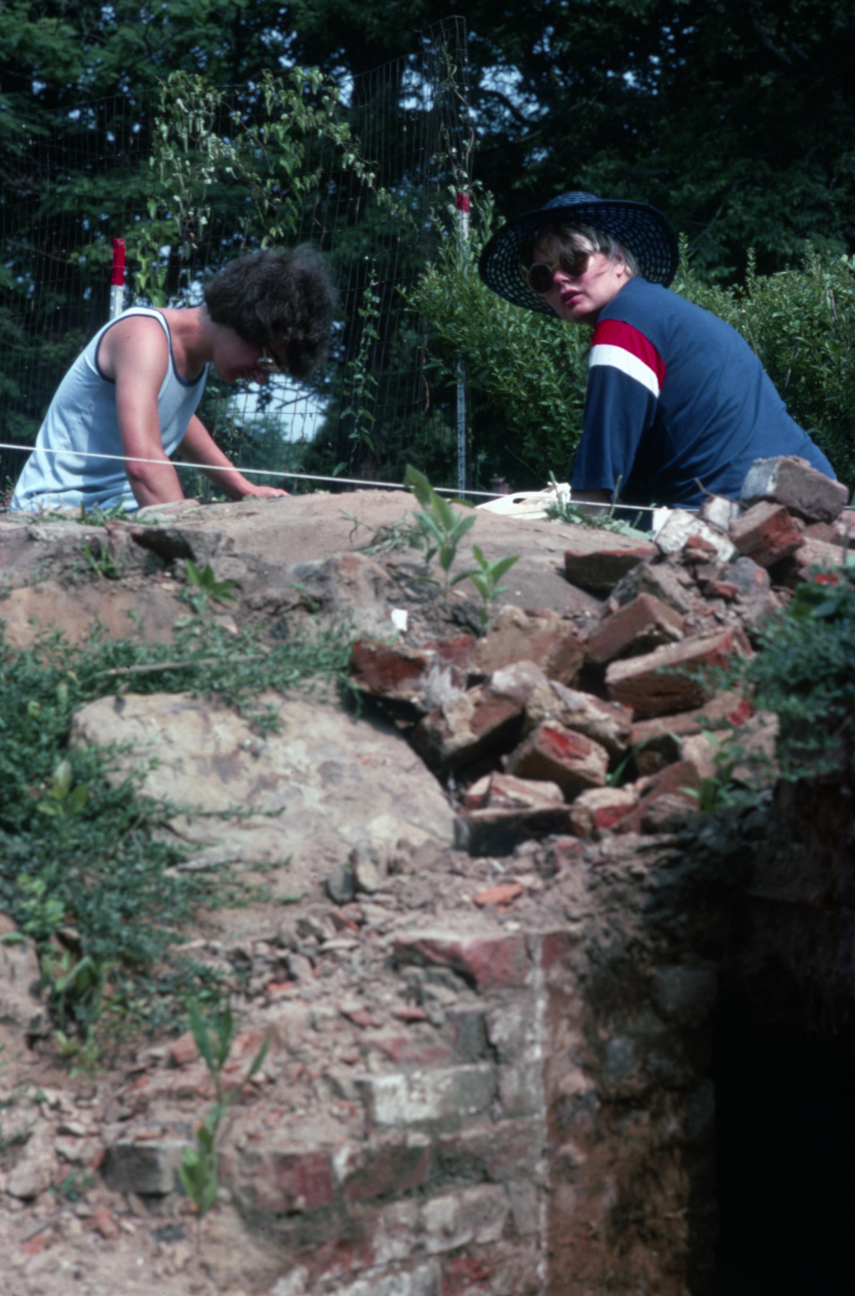 Indiana State University Evansville Archaeological Dig Collection: Russell(Kepler) House. This location was on the bend where Arthur Street merges with North Street. These buildings were moved or demolished to construct the Historic New Harmony Atheneum and parking plat. A group of people working on the dig site.