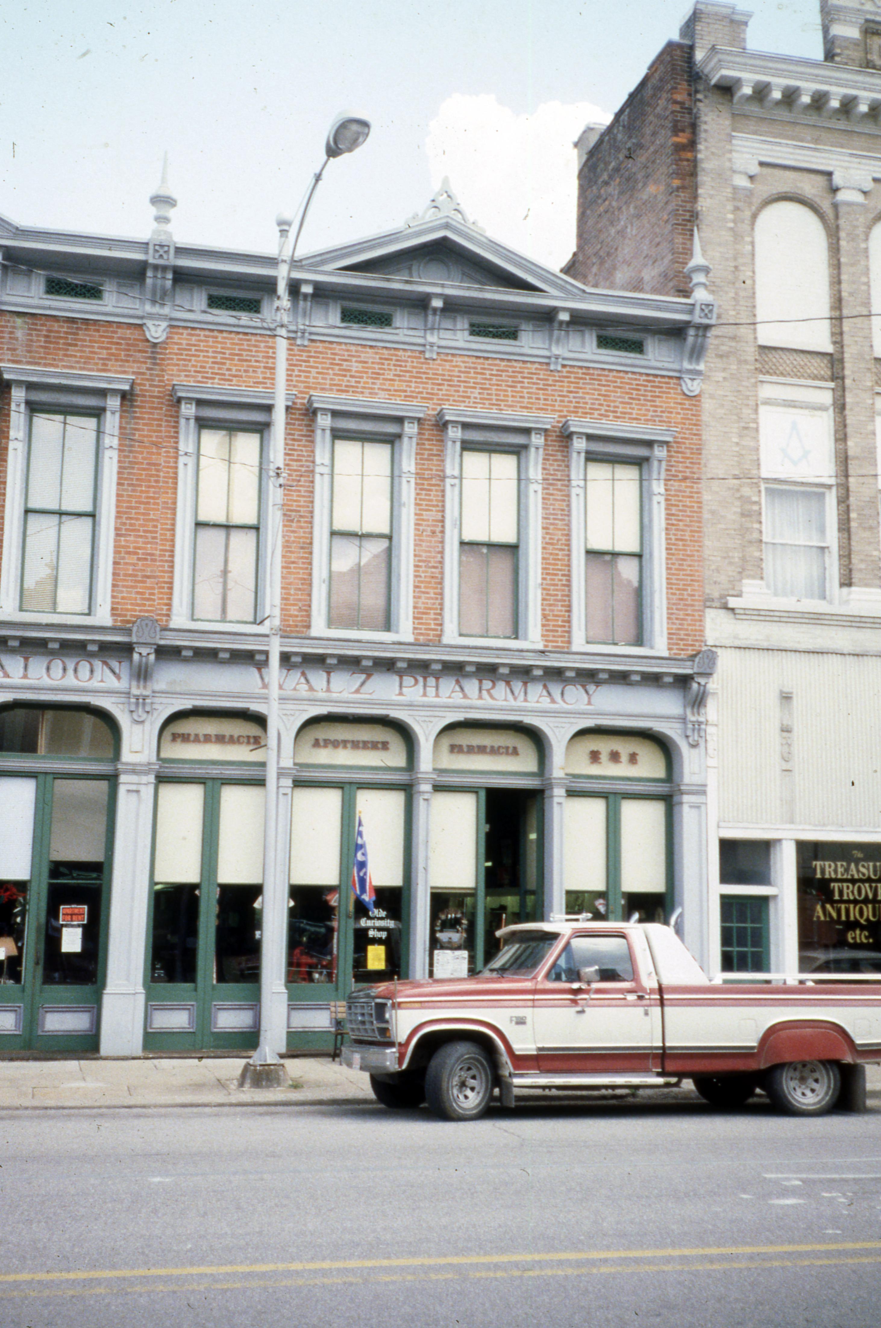 Walz Pharmacy Building: This building is located at 512 Main Street. This building started as a one-story wooden structure (UA58 � 7516 second from right) before 1888. The 1888 Sanborn Map shows it as a brick building, by that point, joined with the Centennial Saloon Building on the plat to the north, left side of the Walz Building both plats were owned by William Baldwin on the 1869 New Harmony Plat Map. Between the late 1880s until some point in the late 1890s the ground floor was home to the Palace Saloon (UA58 � 7509 fifth from the right side). By 1899 the saloon had been replaced by a grocery store which persisted for some time. This photo shows the building twenty-five years after it had been renovated.