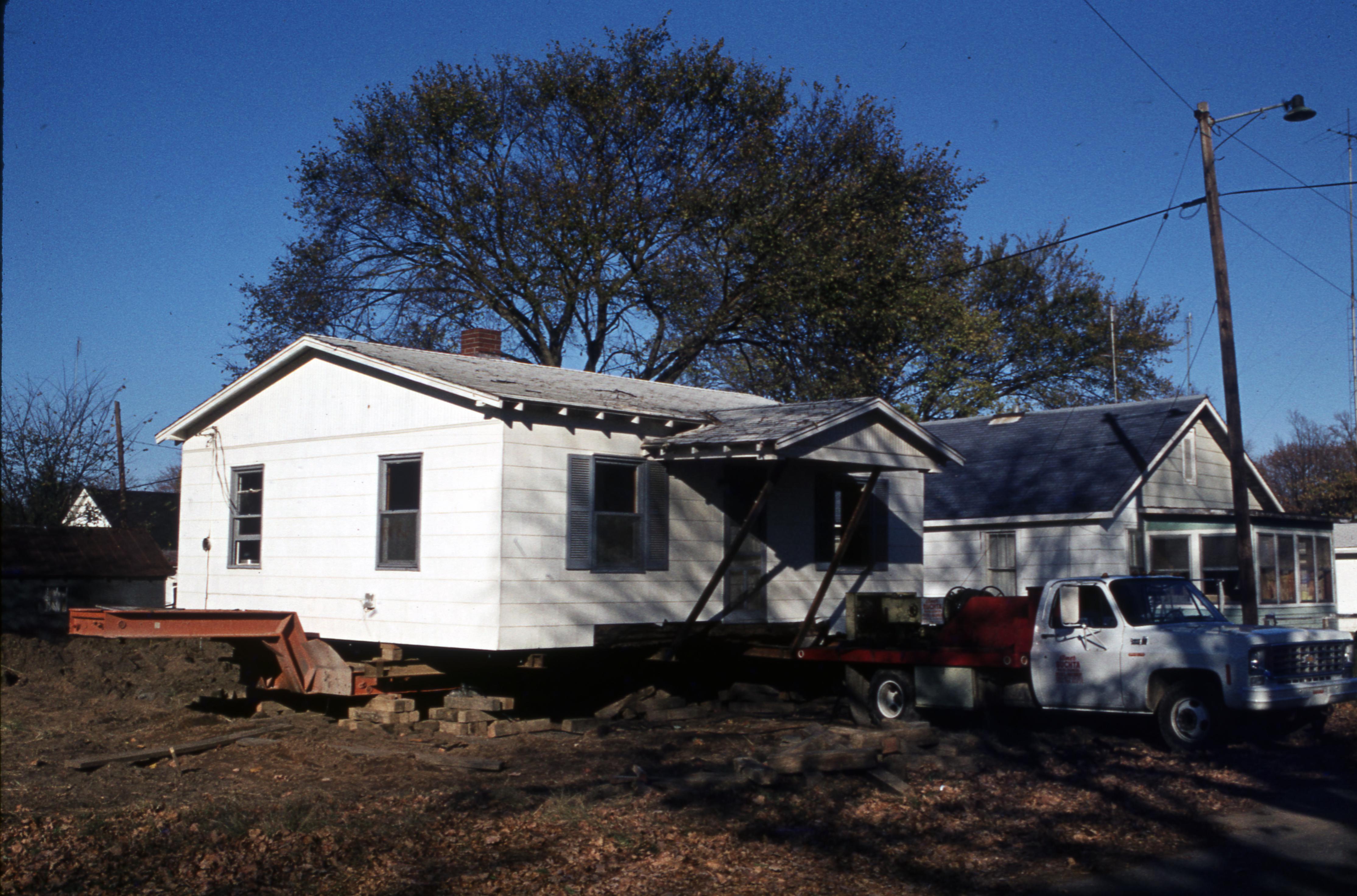Lewis House: This small house was moved from town block 7 E/SW, one plat east of 718 Main Street, to town block 6 C/SW at 312 Steam Mill Street. It was built in 1890 and at some point after 1975 went through a major remodel after it had been moved. The house was moved by Elmer Buchta moving engineers, a company that did most if not all of the moving in New Harmony at this time. In this photo the house is being maneuvered into place on Steam Mill Street. The house just to the right, across the alley is located at 316 Steam Mill.