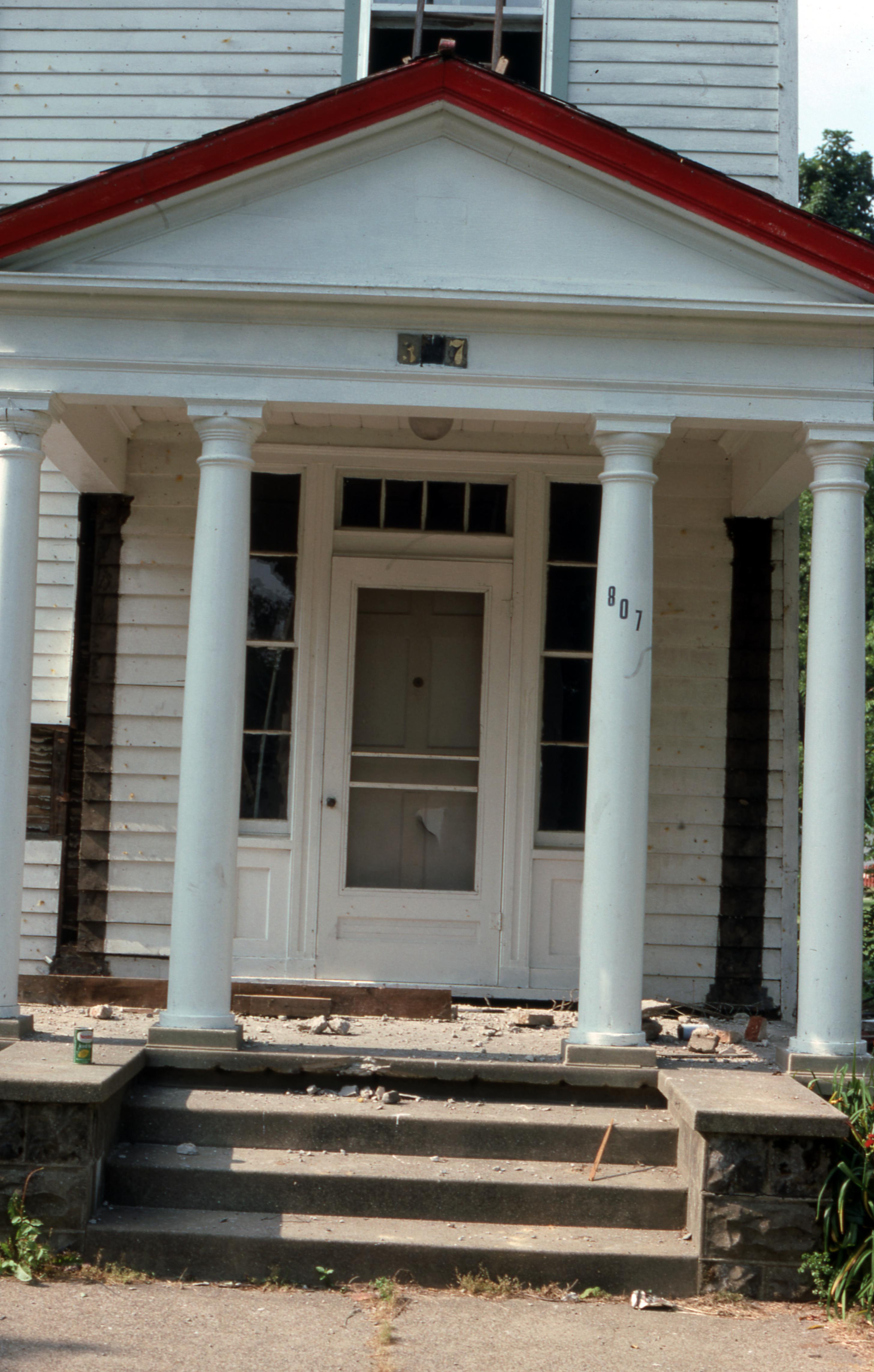 Golden House: This building was moved from the plat of 807 Church, what is now 811 Church Street, to one plat west of 723 E. Church Street but has since been demolished, most likely when the house at 707 E. Church was built in 2009. Elmer Buchta Moving Engineers was contracted for this and many other building moves during the 1970s. This photo shows what the front porch once looked like after moving prep had begun.