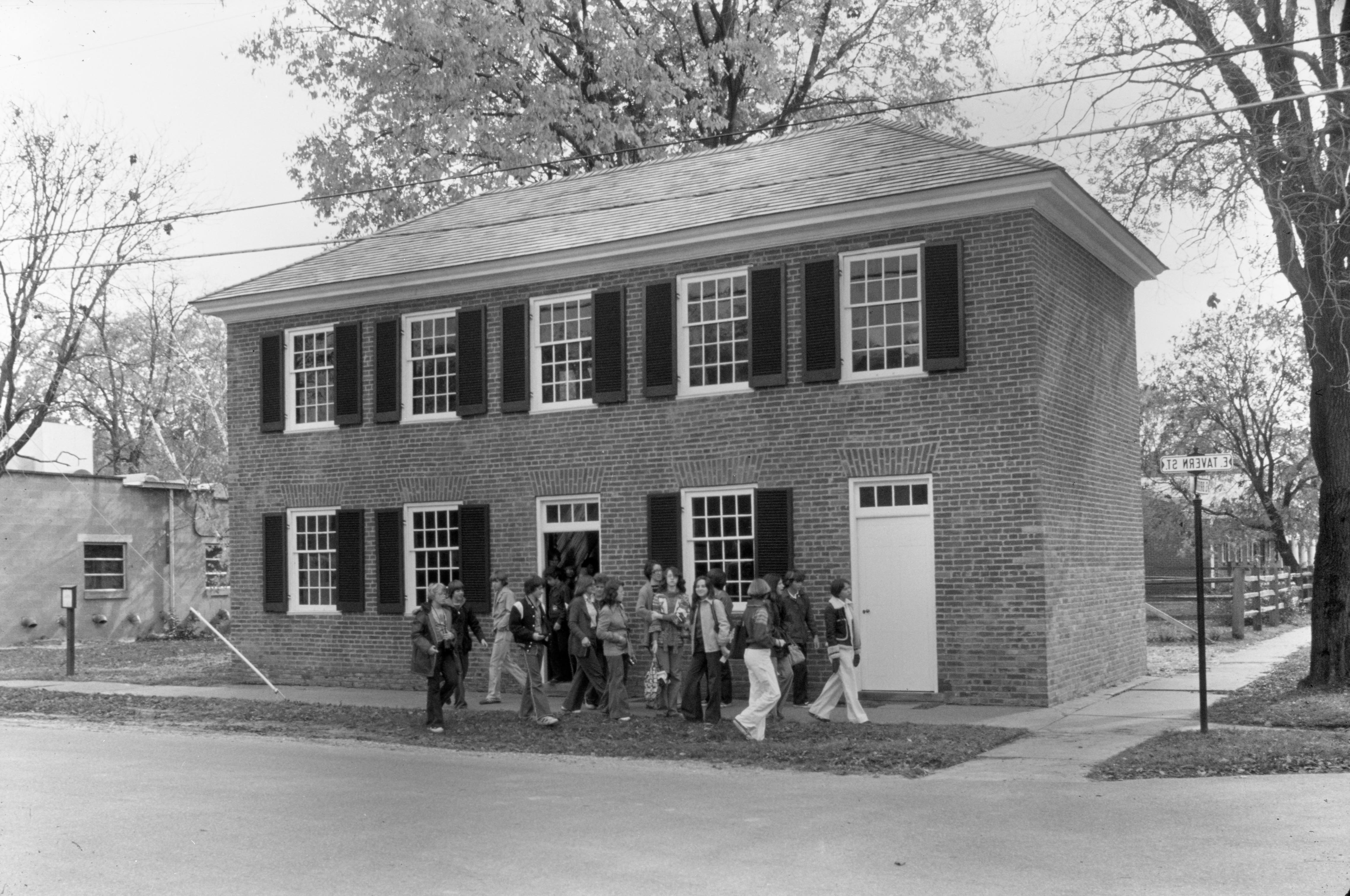 Transparencies and Negatives Collection: Historic photographs. 1830 Owen House: This building is located on the southwest corner of Tavern and Brewery Streets this location is also known as Wiley�s Corner. The house was commissioned by Robert Dale Owen and brother David Dale Owen but was used as a rental property. In the 1970s the hose underwent major rehabilitation and refurbishment, at which time part of the Jaquess House, from which the parlor was taken and moved from somewhere near Poseyville, was added on the west side of the building. This photo shows visitors exiting the building.