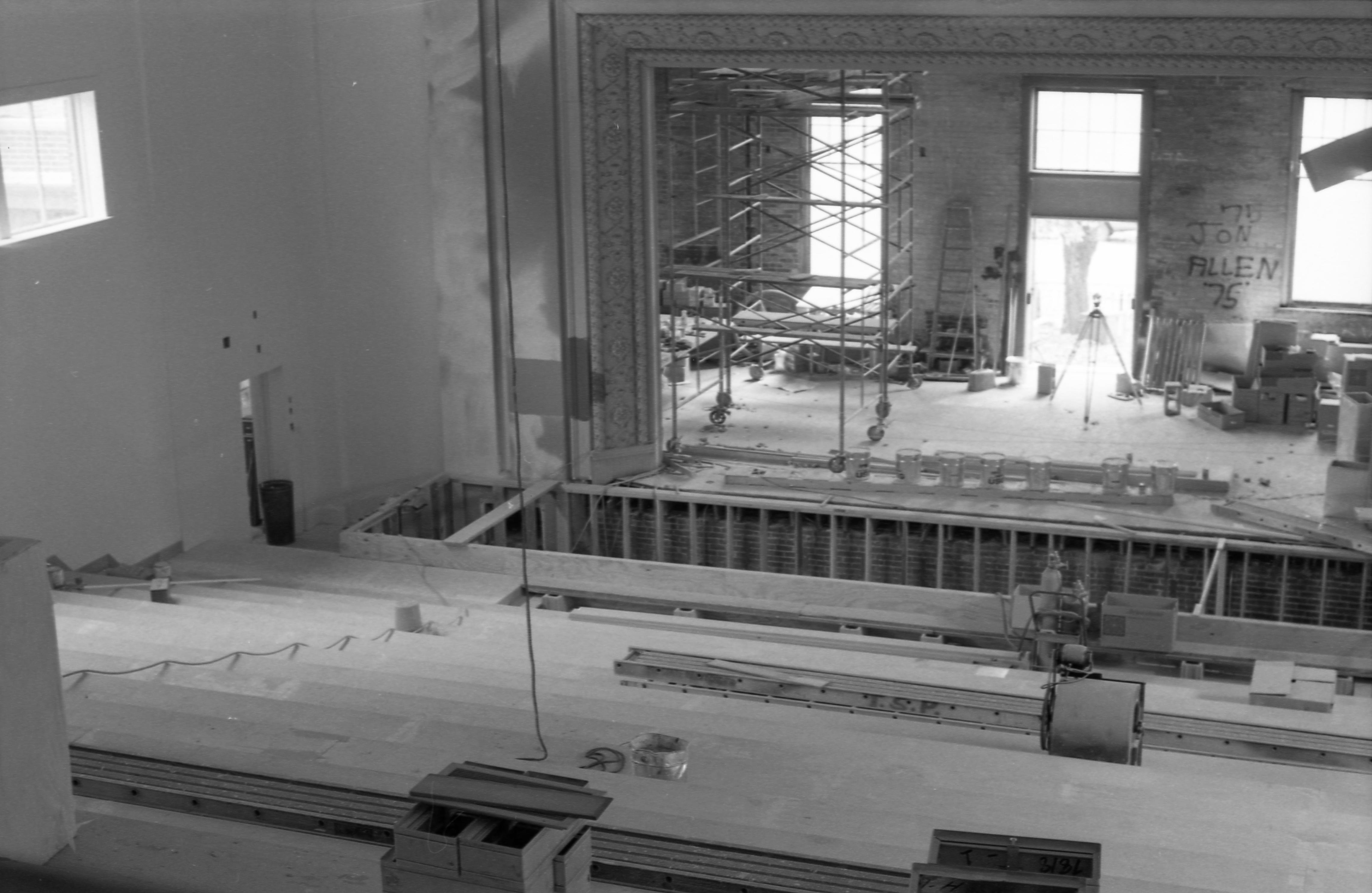 Transparencies and Negatives Collection: Historic photographs. Murphy Auditorium is located at 419 Tavern Street and was constructed on the plat just east of the Working Men's Institute from 1911 to 1913, using the Doctor Edward Murphy Fund, and was built as part of New Harmony's centennial celebration of 1914. In 2014, the town's bicentennial, Murphy Auditorium became the new home of the concert series Under the Beams, originally housed in the Rapp-Owen Granary. Today, the auditorium is owned by the University of Southern Indiana and is the home of The New Harmony Theater with a seating capacity of 360 people. This photo shows construction the stage and seating risers.