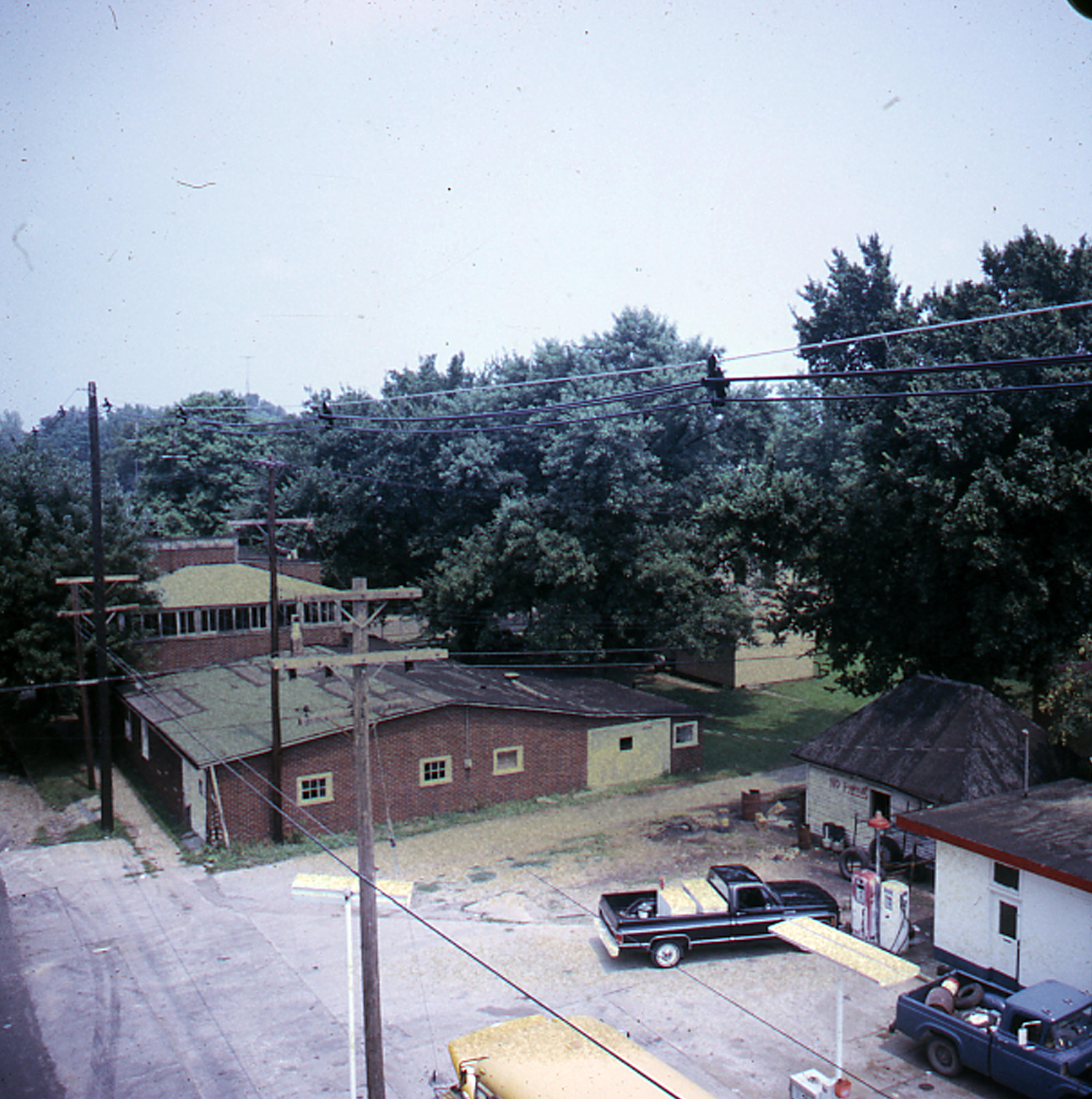 Zephyr Service Station: This lot went through many owners during the 19th century, as per New Harmony Plat Maps, including Loyal in 1858, Wilsey in 1869, and David Randolph by 1880. There was a hotel on this lot during the mid-19th century and it remained until sometime before 1893 when it was converted to a series of attached dwellings. The housing complex was demolished some time before 1899 by which time the house is represented on the Sanborn Map. It was probably built by David Randolph. The large house was still marked on the 1943 Sanborn Fire Insurance Map however, it was demolished at some point when a Zephyr filling station was built on the property which was itself demolished during the Theater Barn Construction and Cooper House Move. On the left side of this photo is Shoultz Funeral Home which would also be demolished for the Wolf House relocation.