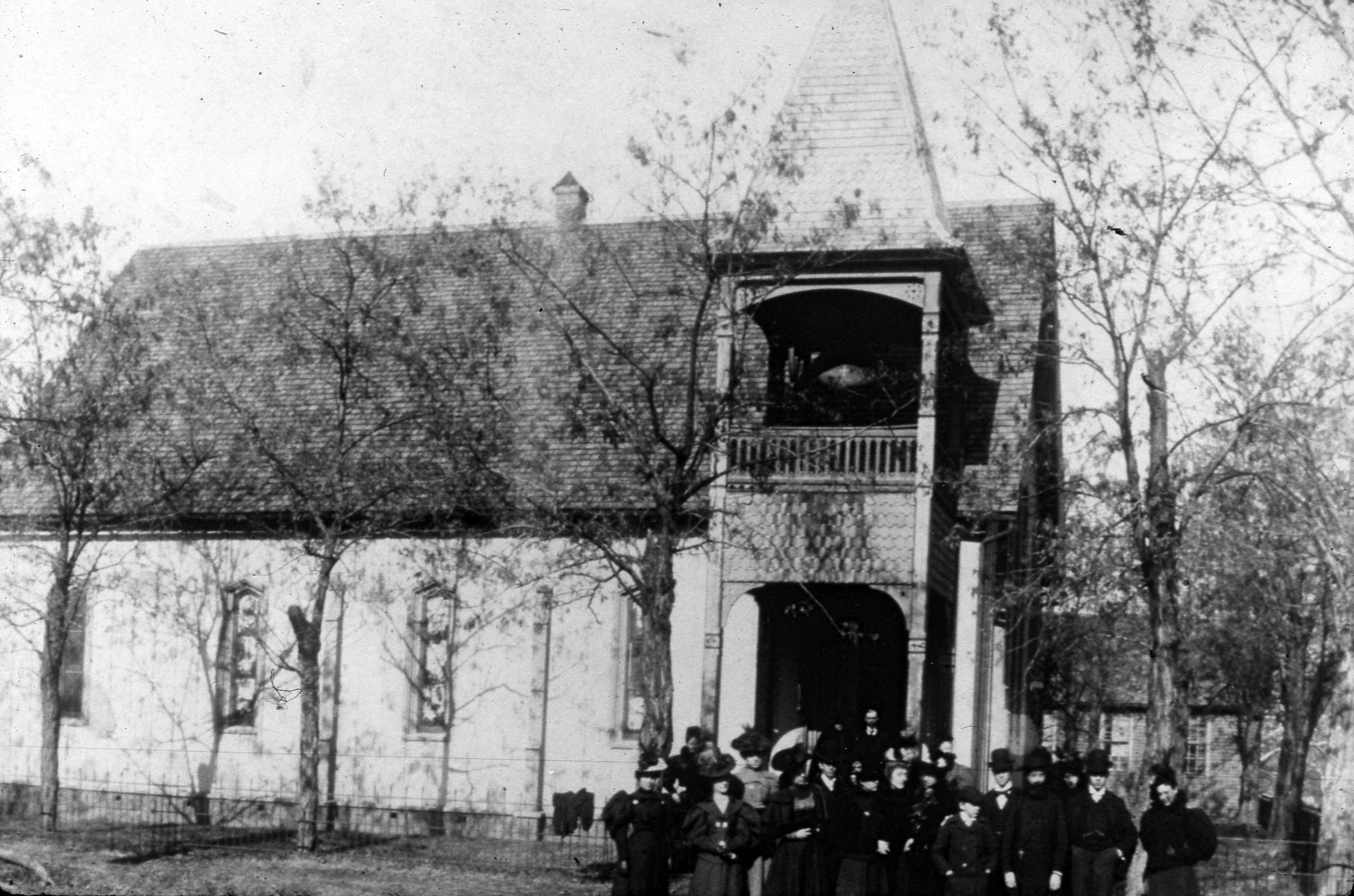 St. Stephen's Episcopal Church: St. Stephen's Episcopal Church: The church was first organized in 1841 and in 1843 the west wing of the old Rappite church was given for use by the Episcopal�s by Alexander and Anne Maclure. At this time the old burial ground was also given to the church, which was bought back by the Rappites in 1846. Then in 1850 the Episcopal�s sold the west wing of the old Rappite Church for $1000 and in 1854 St. Stephen�s Church was constructed, the North Street location where the Lenz House now resides.1888 saw the construction of a new belfry add to the church to accommodate the new bell. In 1911 the new church was built, and an addition was made to it in 1927. The church is still present as of 2022. This is a photo of the church on North Street, after the belfry was constructed in 1888. It shows a service exiting the building.