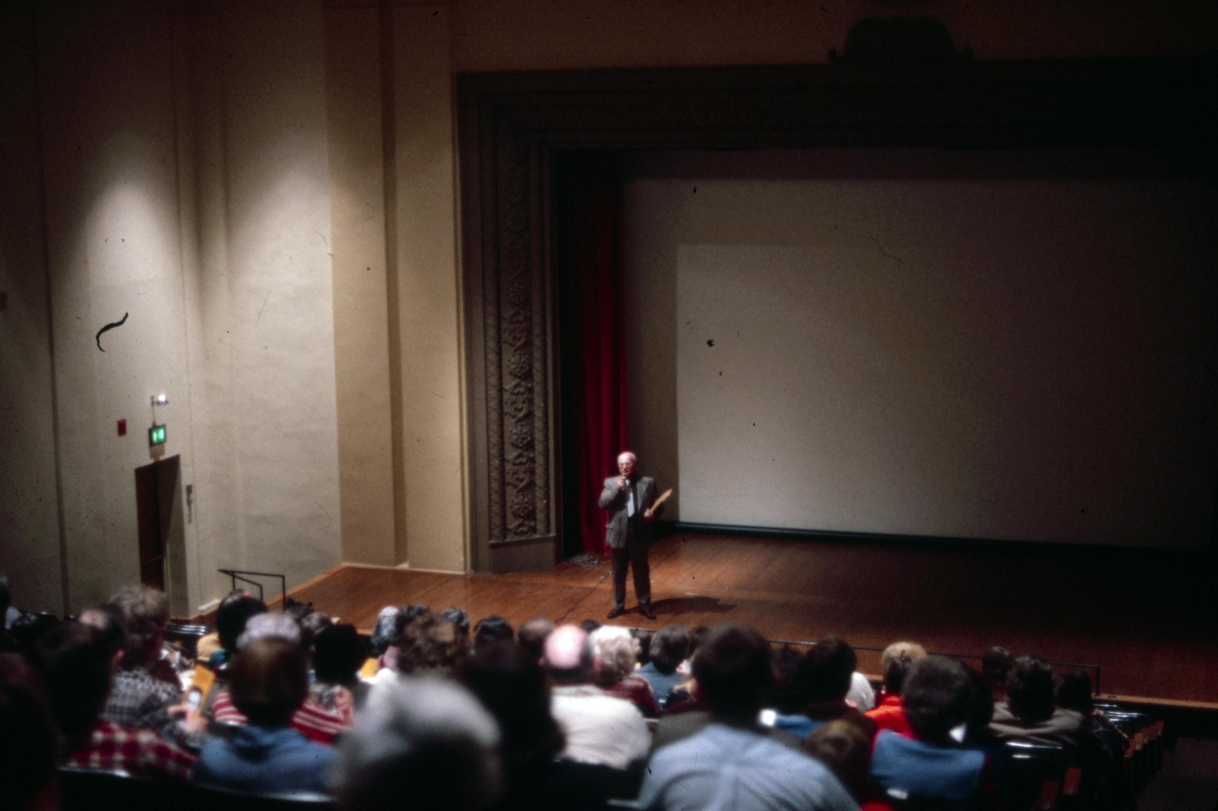 Murphy Auditorium: Murphy Auditorium is located at 419 Tavern Street and was constructed on the plat just east of the Working Men's Institute from 1911 to 1913, using the Doctor Edward Murphy Fund, and was built as part of New Harmony's centennial celebration of 1914. In 2014, the town's bicentennial, Murphy Auditorium became the new home of the concert series Under The Beams, originally housed in the Rapp-Owen Granary. Today, the auditorium is owned by the University of Southern Indiana and is the home of The New Harmony Theater with a seating capacity of 360 people. In this photo a man is giving a speech before giving an award to another man.