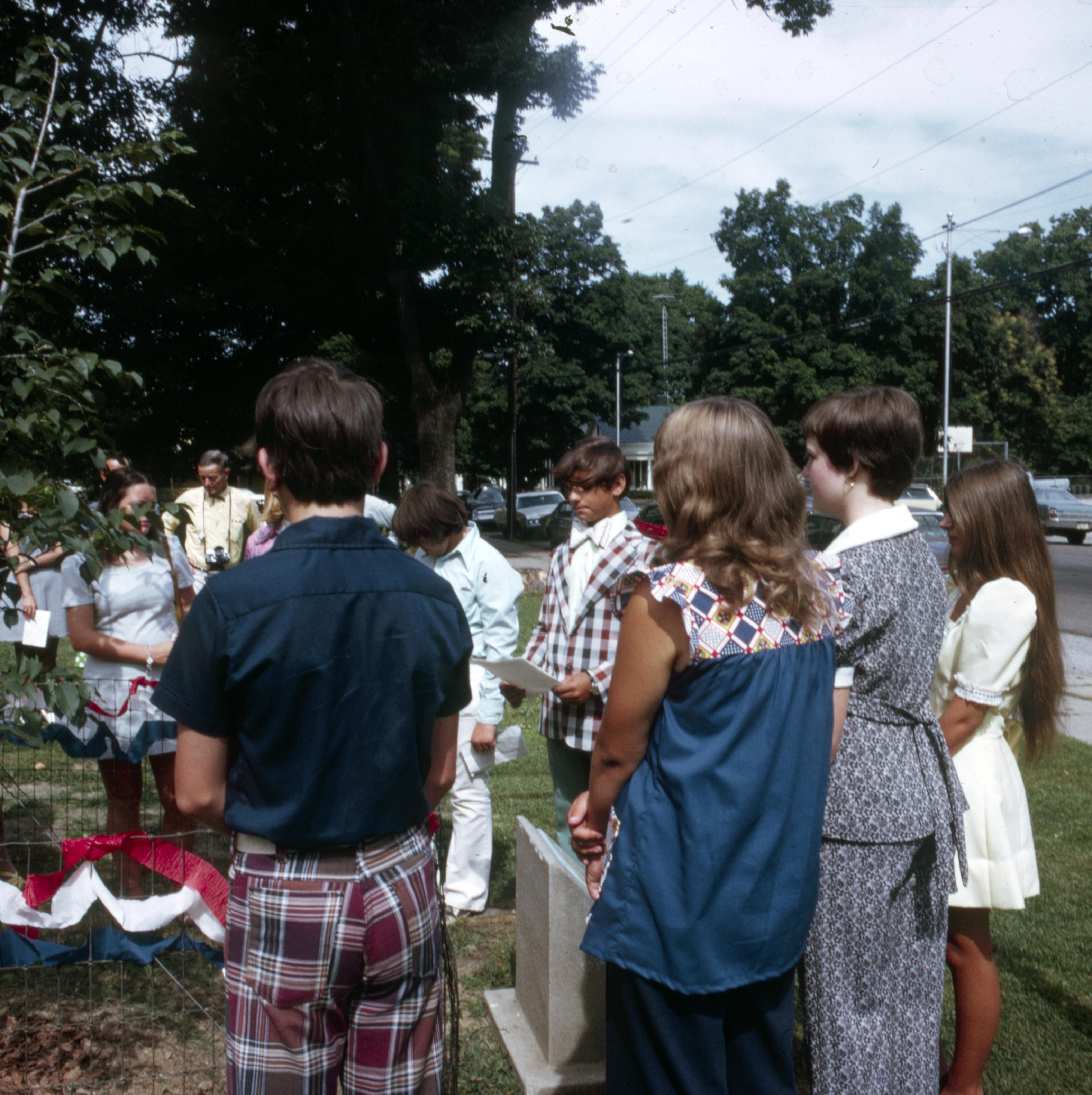 Guild Of Guides: The New Harmony chapter of the Indiana Junior Historical Society was called The Guild of Guides. The IJHS was formed in 1938 and this society had chapters, across the state of Indiana, which were formed by junior high and high school students who had an interest in historical things. The Guild of Guides produced a paper and photographs, in 1968, titled Architecture In New Harmony, Indiana, 1814 - 1969 which was published in a periodical produced by the IJHS. In this photo the group is standing, for the dedication of a tree, in front of the stone marker set at the front of Murphy Auditorium. This tree is still present in 2021 and is somewhat dislodging the stone marker.