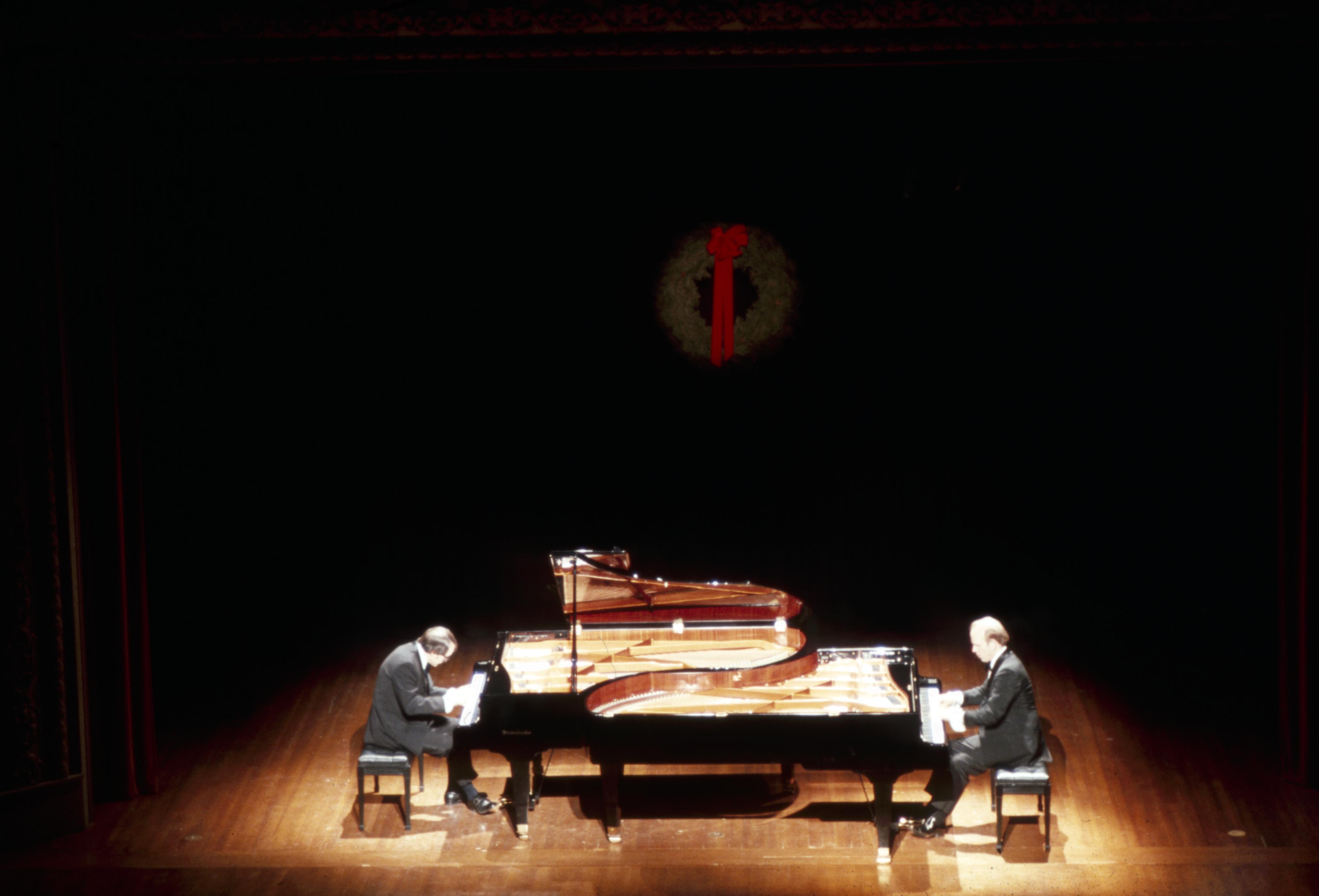 Murphy Auditorium: Murphy Auditorium is located at 419 Tavern Street and was constructed on the plat just east of the Working Men's Institute from 1911 to 1913, using the Doctor Edward Murphy Fund, and was built as part of New Harmony's centennial celebration of 1914. In 2014, the town's bicentennial, Murphy Auditorium became the new home of the concert series Under The Beams, originally housed in the Rapp-Owen Granary. Today, the auditorium is owned by the University of Southern Indiana and is the home of The New Harmony Theater with a seating capacity of 360 people. This photo is of a duel piano concert with two grand pianos. Note the holiday wreath on the wall in the background.