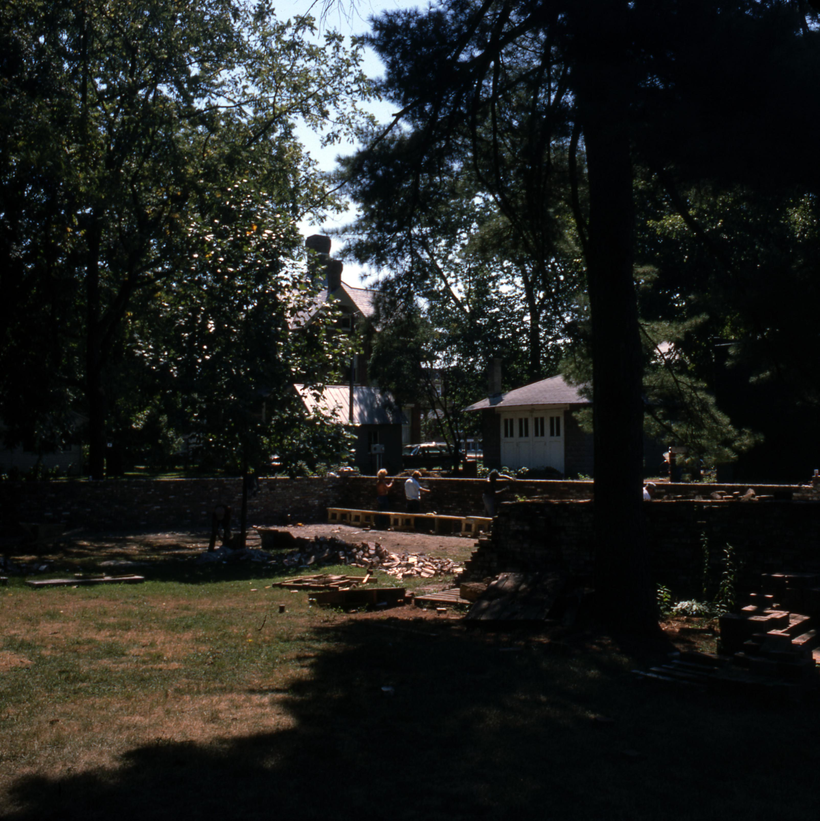 The repairing of the brick wall surrounding the cemetery. The Harmonist Cemetery located at the end of Granary and West Street. The cemetery was originally located in part of the Harmonist orchard and was fenced in with a brick wall in 1874. Located within the wall are at least 20 Middle Woodland Period mounds most likely of the Hopewell people. The property is maintained by the Indiana State Museum and Historic Sites.