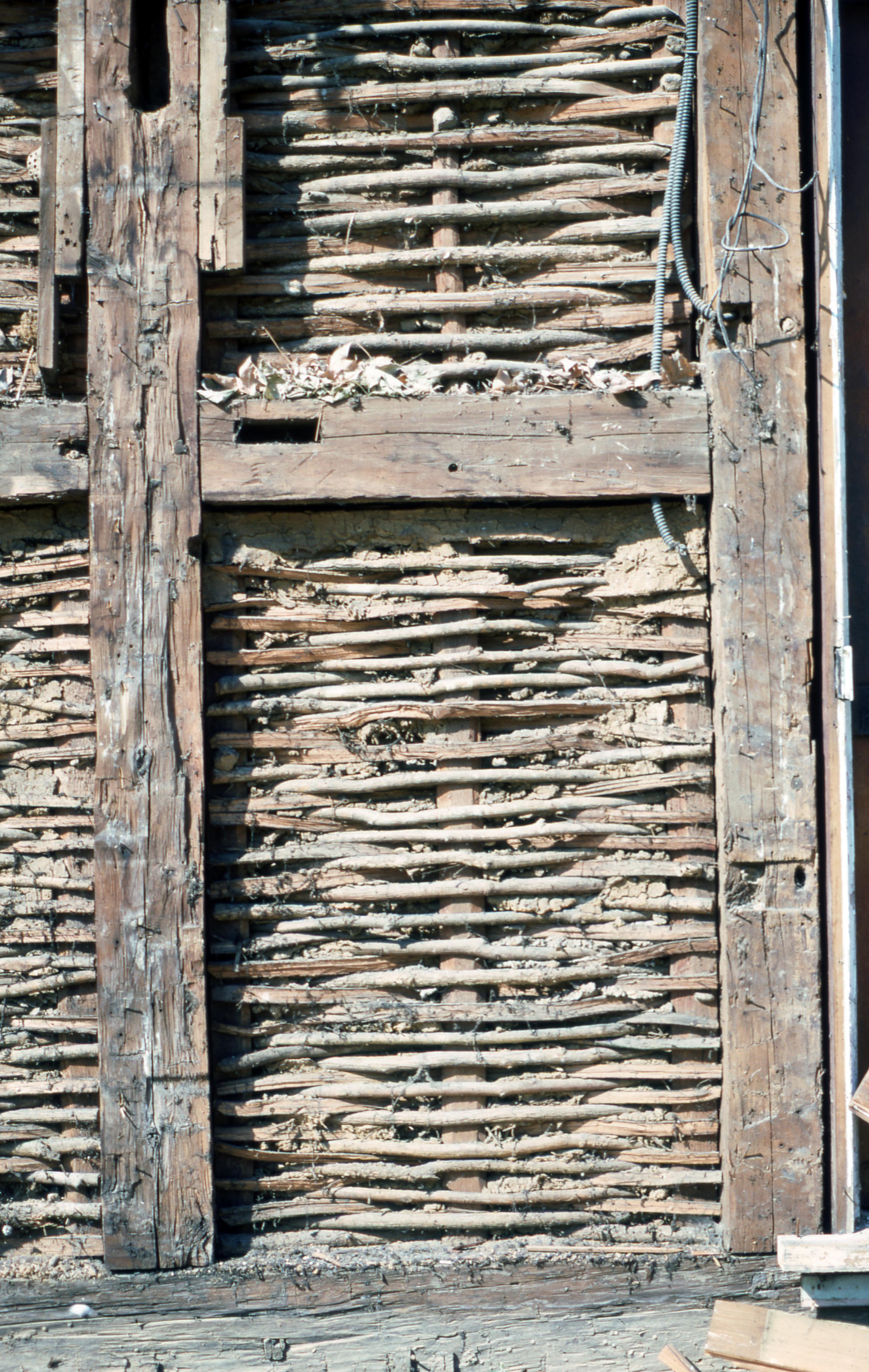 Beal House: The Beal House was moved during the Lanark Construction, on Town Block 8 E/W on Main Street to 611 Church Street. The Beal house was constructed around 1829 by John Beal, who was a carpenter in the Owen and Maclure community. Beal constructed the house from lumber and timbers from an older horse barn. The new location would be the site of the Beal House and 1850s Doctor's Office (The Doctor's Office was a remodel of the Kemmerling House, which was also moved to this site). Elmer Buchta Moving Engineers was contracted for this and many other building moves during the 1970s. In this photo the old clapboards have been completely removed from the timber frame walls. Note the wattle and daub infill.
