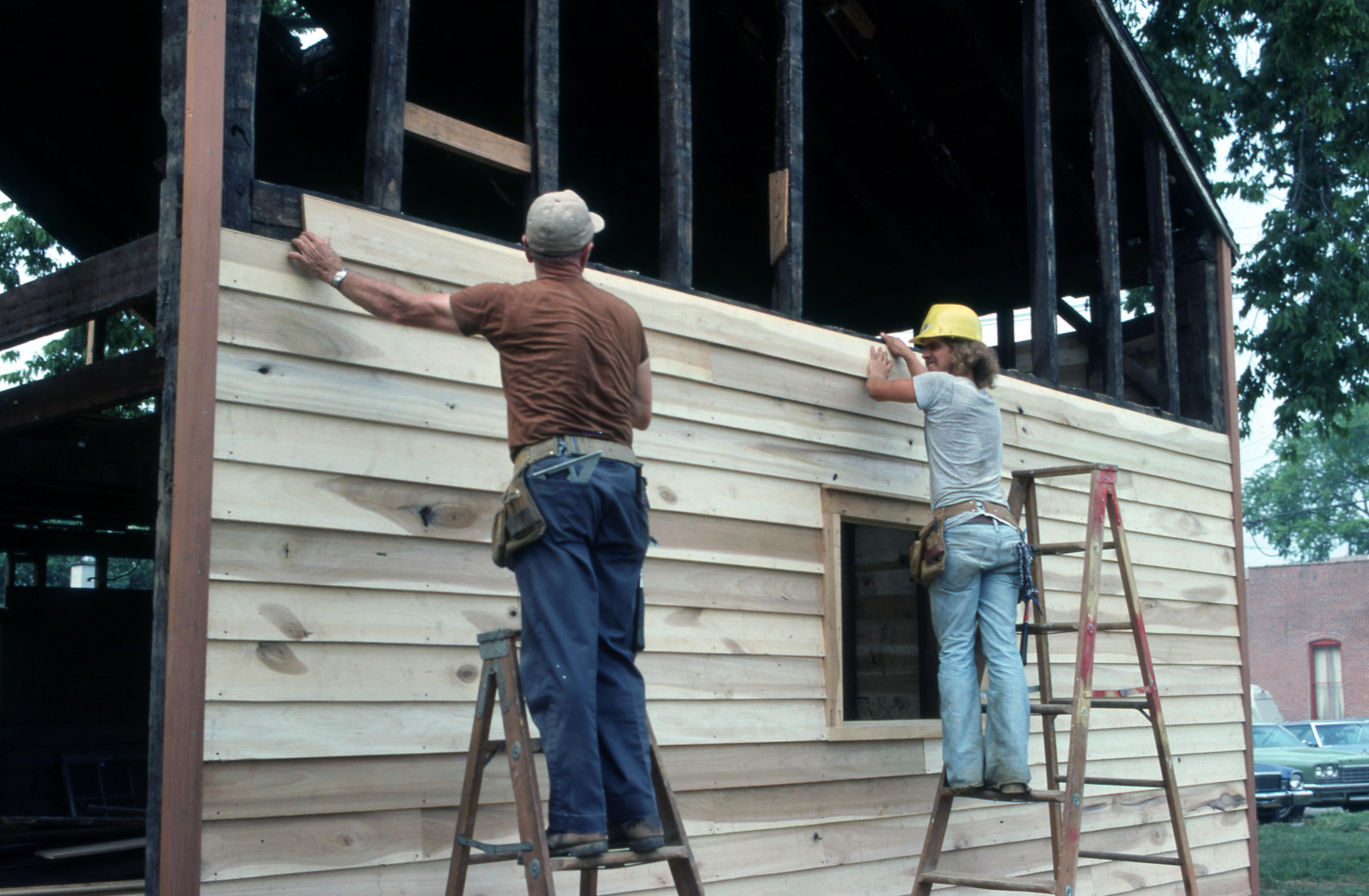 Kemmerling House: The Kemmerling House was relocated from town Block 4 J/SE to the new location at 611 Church Street, beside the Beal House. The Kemmerling House was remodeled into the 1850s Doctor's Office, a gift to the town of New Harmony from Mead Johnson. The Kemmerlings were listed in the 1882 Posey County Directory (as Kimmerlin) as being New Harmony Township farmers. Elmer Buchta Moving Engineers was contracted for this and many other building moves during the 1970s. In this photo two construction workers are installing new clapboards on the north, front, side of the house.