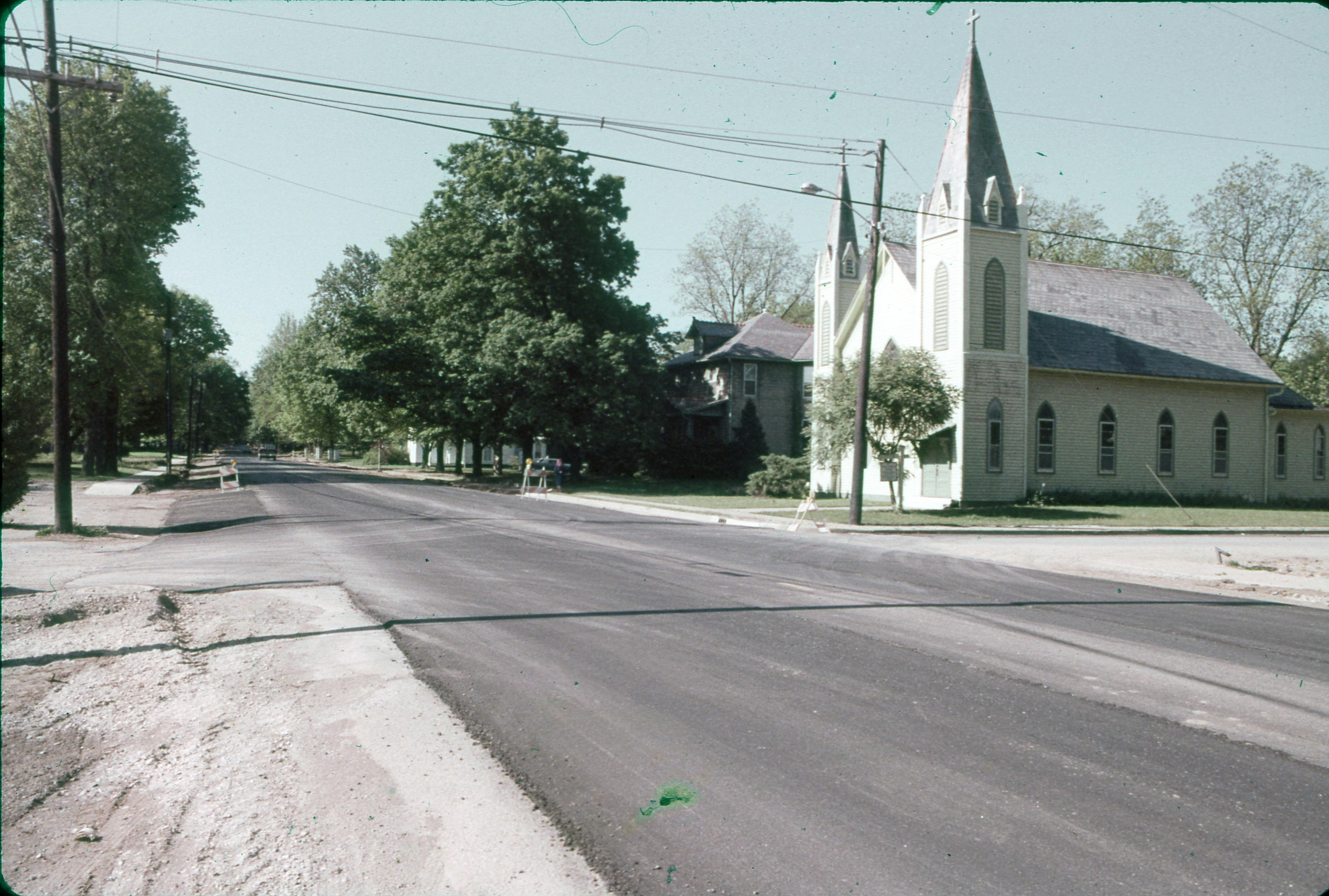Streets Collection: Main Street. The intersection of Main and South Streets after new pavement had been laid down by Feigel Construction Corp. Main Street facing south. Holy Angels Catholic Rectory is on the right side of the photo.