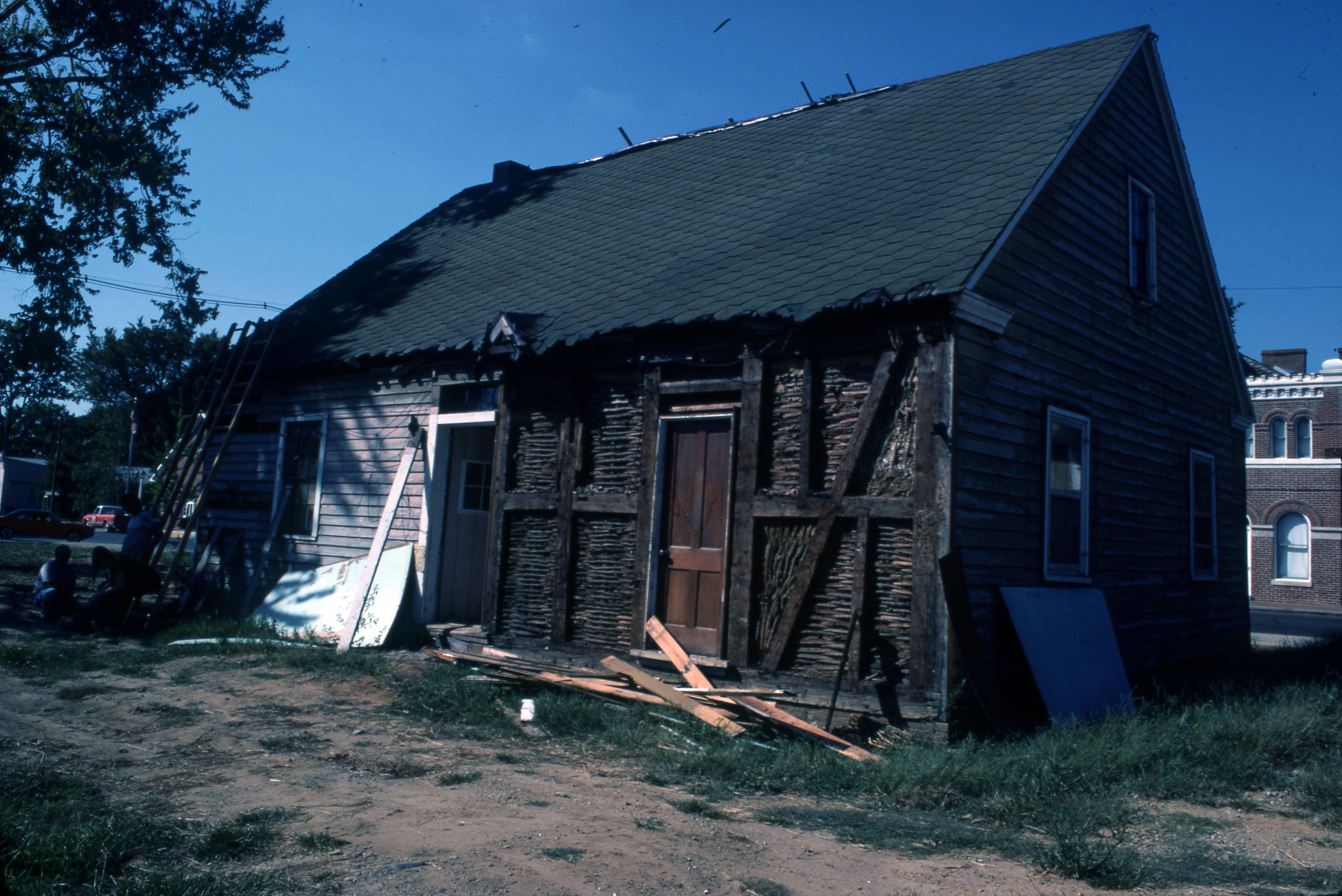 Beal House: The Beal House was moved during the Lanark Construction, on Town Block 8 E/W on Main Street to 611 Church Street. The Beal house was constructed around 1829 by John Beal, who was a carpenter in the Owen and Maclure community. Beal constructed the house from lumber and timbers from an older horse barn. The new location would be the site of the Beal House and 1850s Doctor's Office (The Doctor's Office was a remodel of the Kemmerling House, which was also moved to this site). Elmer Buchta Moving Engineers was contracted for this and many other building moves during the 1970s. In this photo the old clapboards are being stripped off the timber frame walls. A section, on the right side of the house, was left exposed, under glass, to show this old type of construction. On the right side of the photo, across Church Street, is Thrall's Opera House.