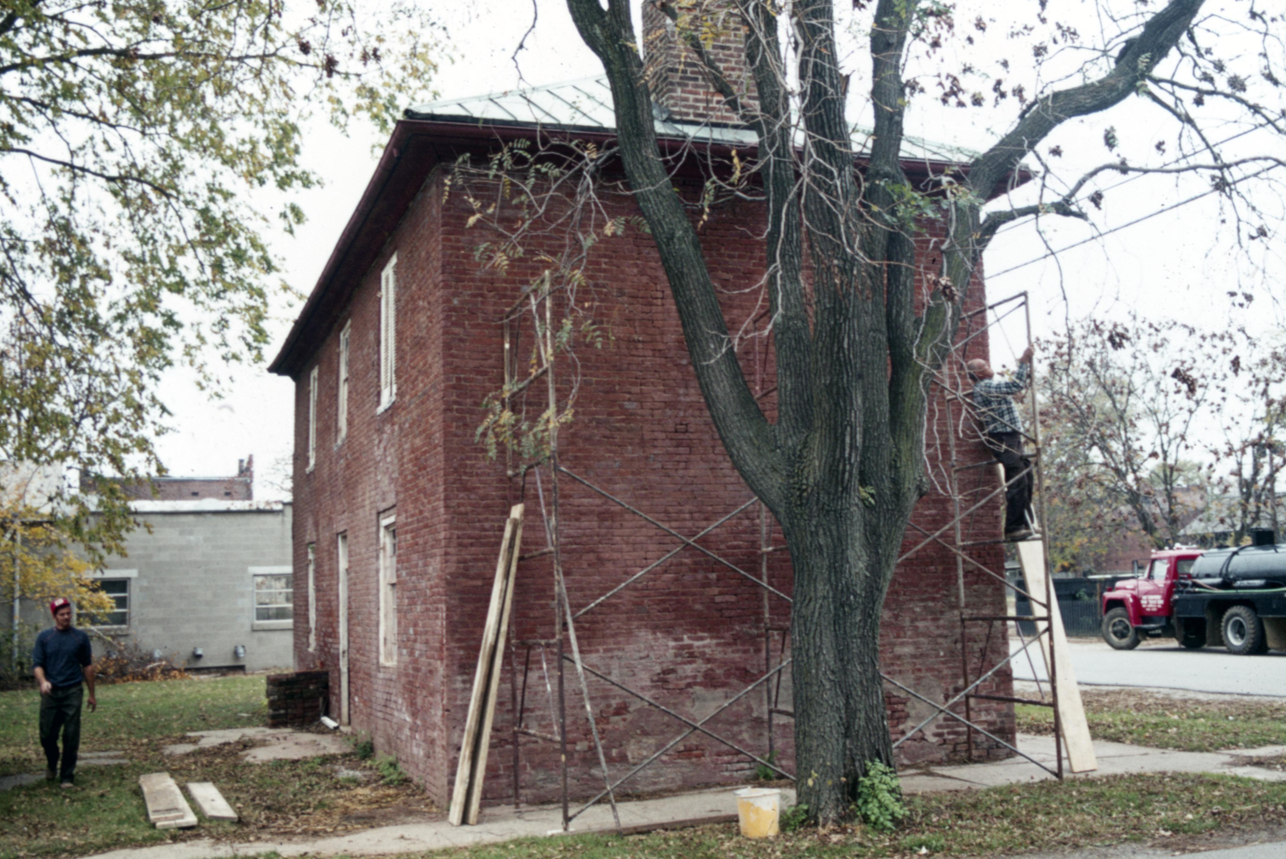 1830 Owen House: The east side of the 1830 Owen House. One workman is inspecting the back side of the house while another constructs scaffolding on the east side of the house.