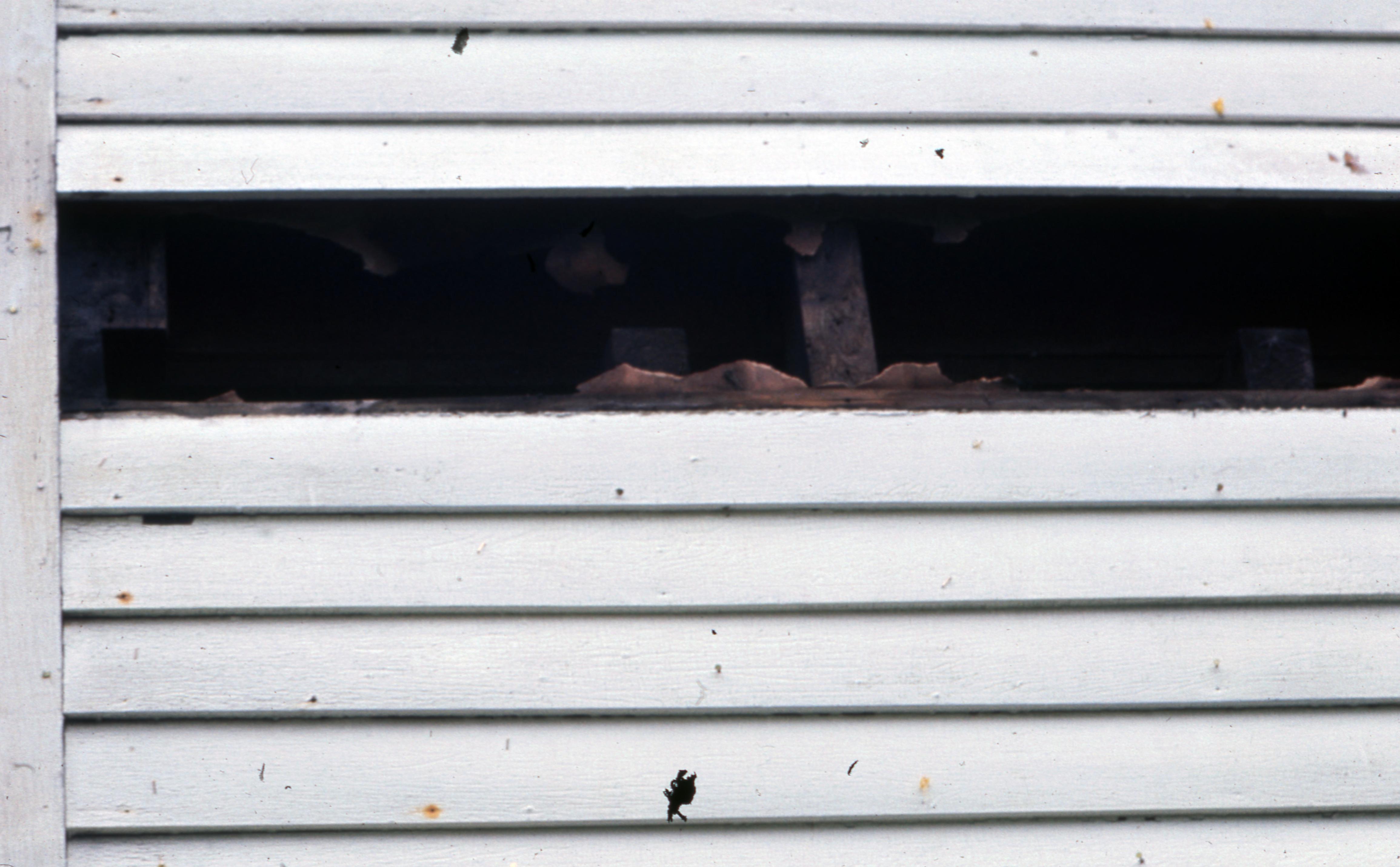 Golden House: This building was moved from the plat of 807 Church, what is now 811 Church Street, to one plat west of 723 E. Church Street but has since been demolished, most likely when the house at 707 E. Church was built in 2009. Elmer Buchta Moving Engineers was contracted for this and many other building moves during the 1970s. This photo shows the old frame of the house under the clapboards before the house was moved to the new location.