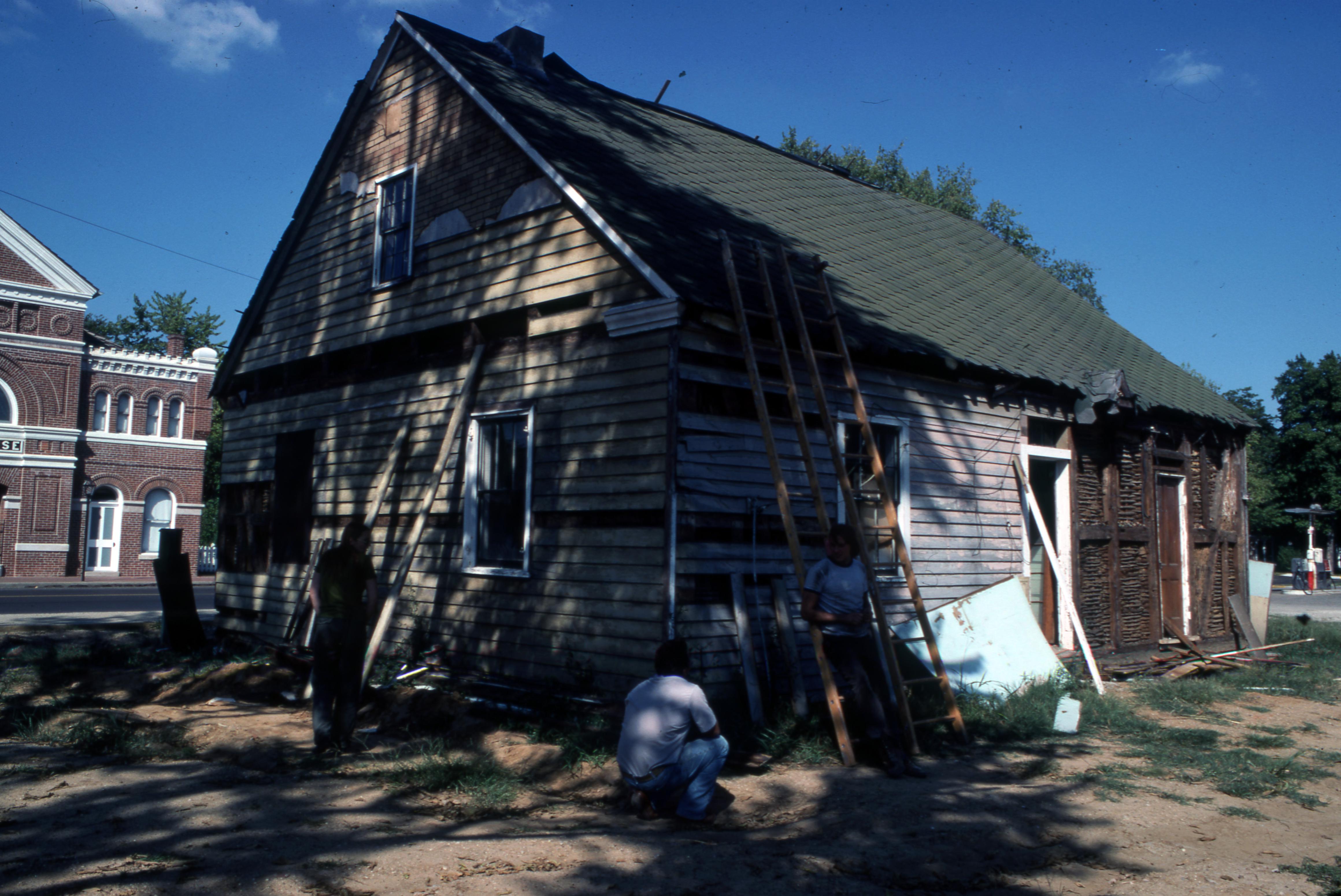 Beal House: The Beal House was moved during the Lanark Construction, on Town Block 8 E/W on Main Street to 611 Church Street. The Beal house was constructed around 1829 by John Beal, who was a carpenter in the Owen and Maclure community. Beal constructed the house from lumber and timbers from an older horse barn. The new location would be the site of the Beal House and 1850s Doctor's Office (The Doctor's Office was a remodel of the Kemmerling House, which was also moved to this site). Elmer Buchta Moving Engineers was contracted for this and many other building moves during the 1970s. In this photo the old clapboards are being stripped off the timber frame walls. A section, on the right side of the house, was left exposed, under glass, to show this old type of construction. On the left side of the photo, across Church Street, is Thrall's Opera House.