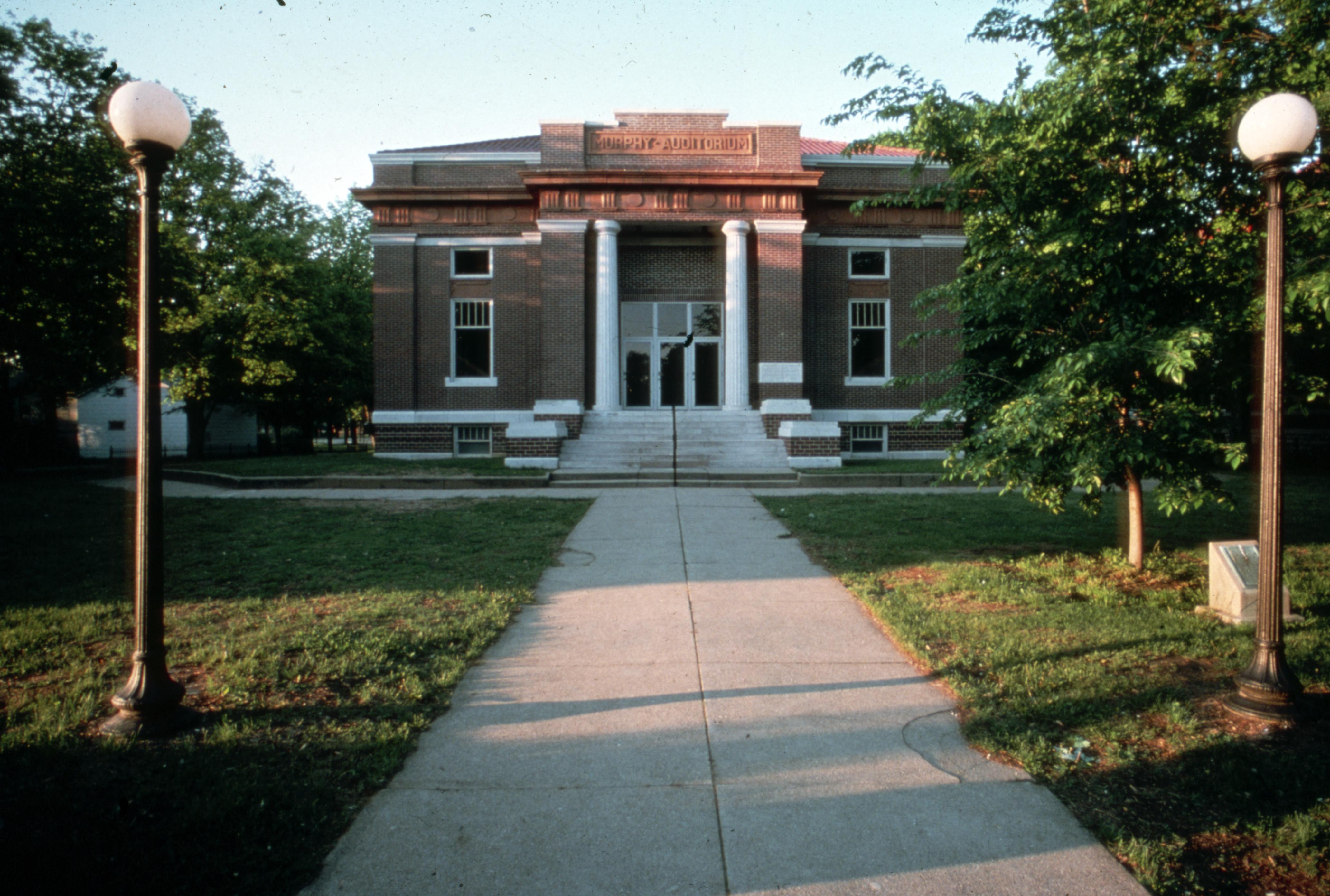 Murphy Auditorium: Murphy Auditorium is located at 419 Tavern Street and was constructed on the plat just east of the Working Men's Institute from 1911 to 1913, using the Doctor Edward Murphy Fund, and was built as part of New Harmony's centennial celebration of 1914. In 2014, the town's bicentennial, Murphy Auditorium became the new home of the concert series Under The Beams, originally housed in the Rapp-Owen Granary. Today, the auditorium is owned by the University of Southern Indiana and is the home of The New Harmony Theater with a seating capacity of 360 people. This is a view of the auditorium front entrance. This is the north side of the building which faces Tavern Street.