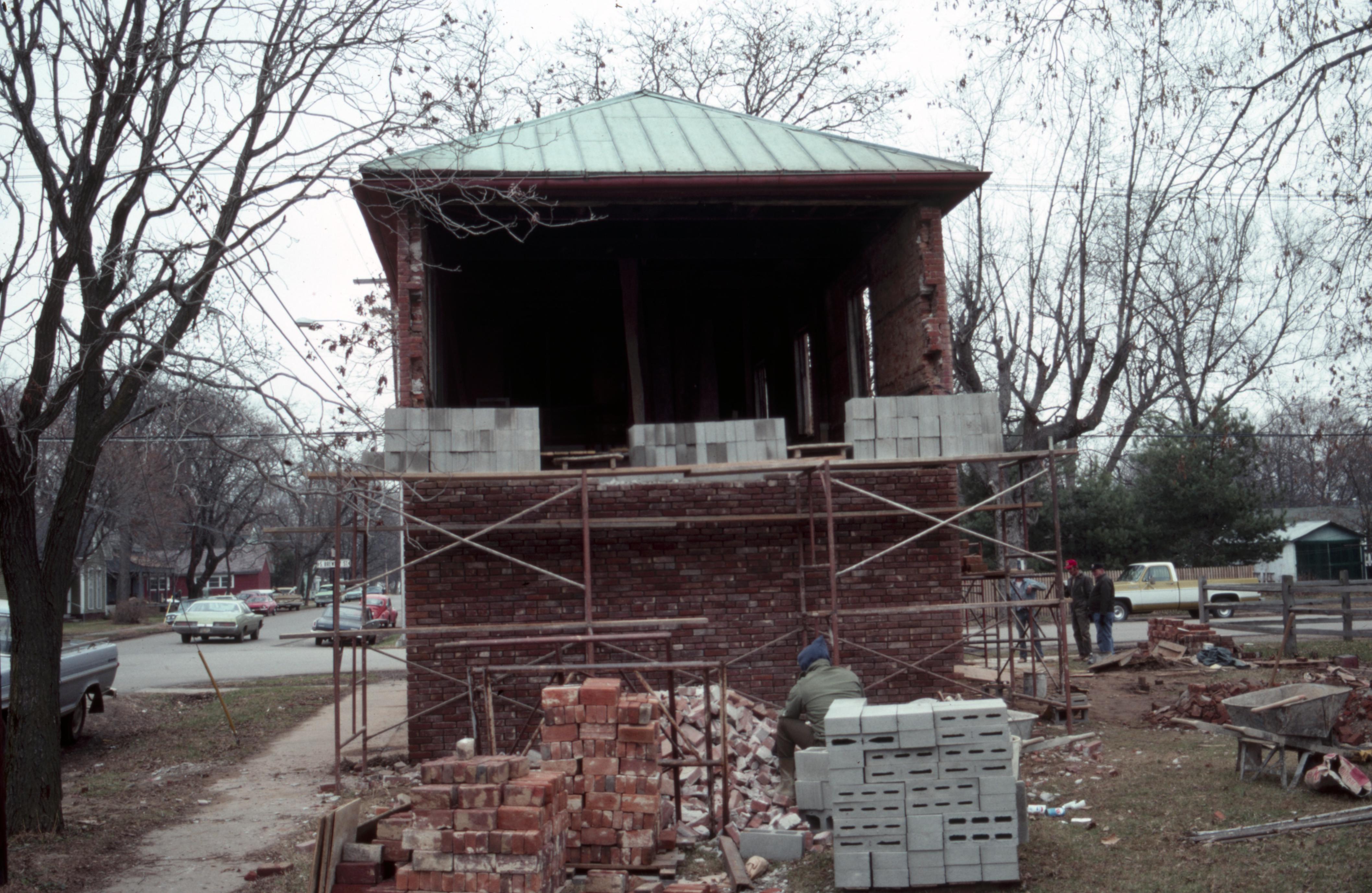 1830 Owen House: Four construction workers making repairs to brickwork on the 1830 Owen House. One is sorting bricks to start on the second floor on the west side of the house.