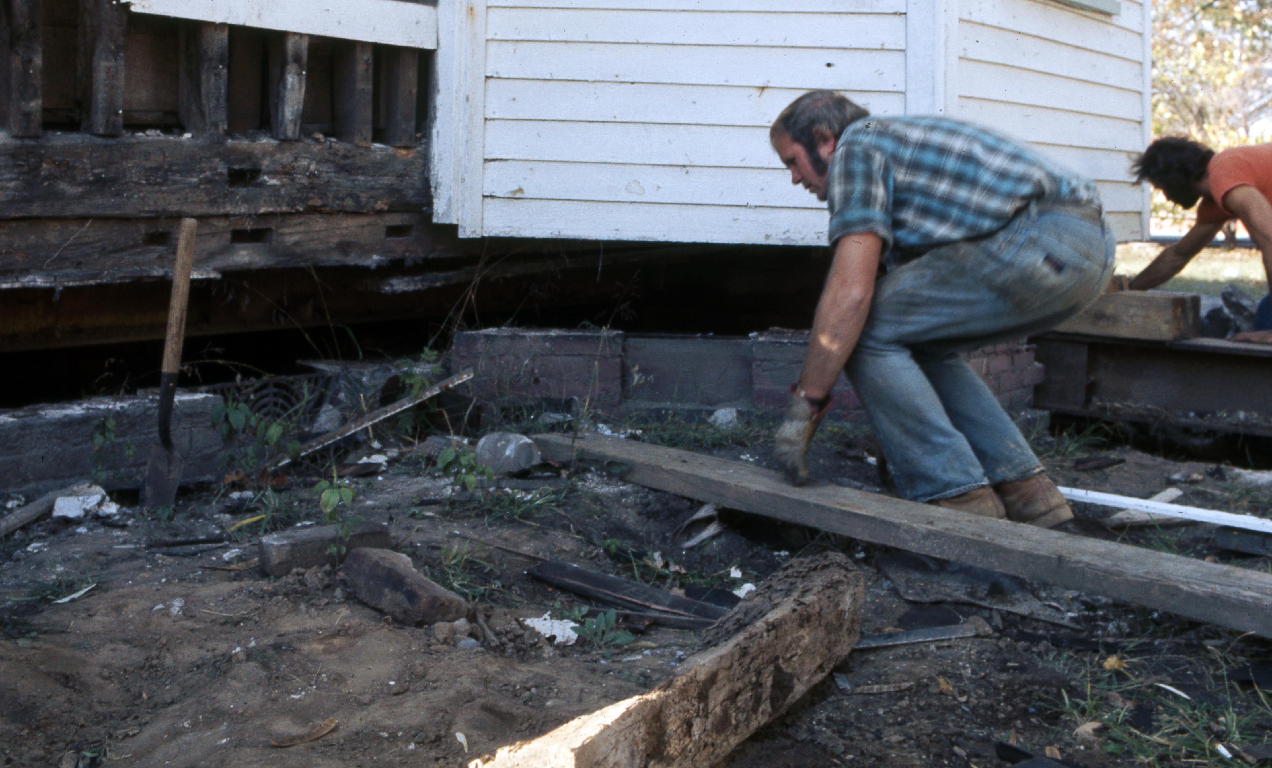Golden House: This building was moved from the plat of 807 Church, what is now 811 Church Street, to one plat west of 723 E. Church Street but has since been demolished, most likely when the house at 707 E. Church was built in 2009. Elmer Buchta Moving Engineers was contracted for this and many other building moves during the 1970s. In this photo construction workers are removing the chocks from under the house so it can be moved to the new location.