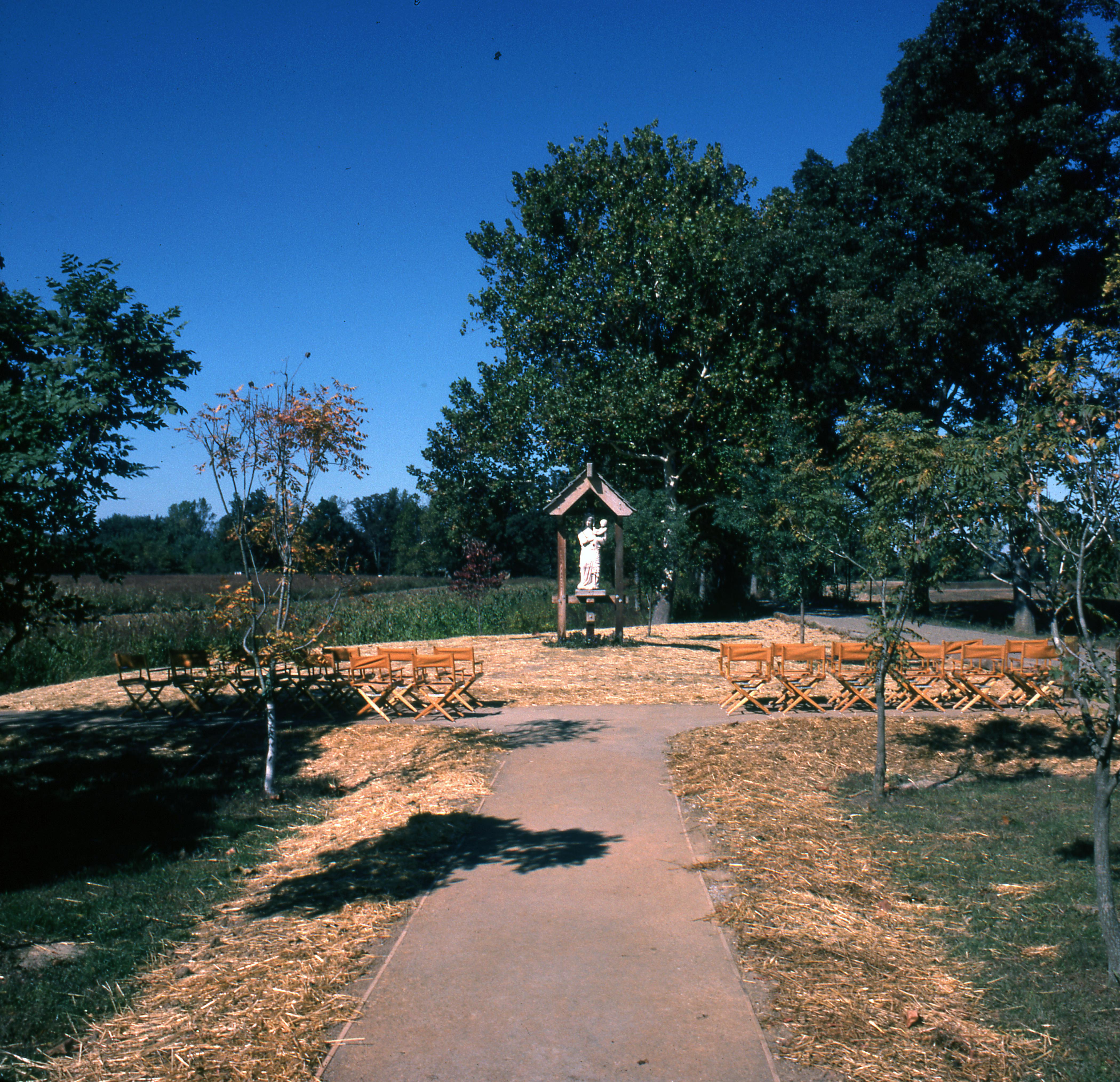 Our Lady Queen of Peace Shrine also known as Wayward Shrine is located on in front of The Roofless Church. The shrine was created in France in the 15th century and is dedicated to the Trappist Monk Thomas Merton. This image is part of The Lois Muller Collection which is part of the Historic New Harmony Slide Collection.