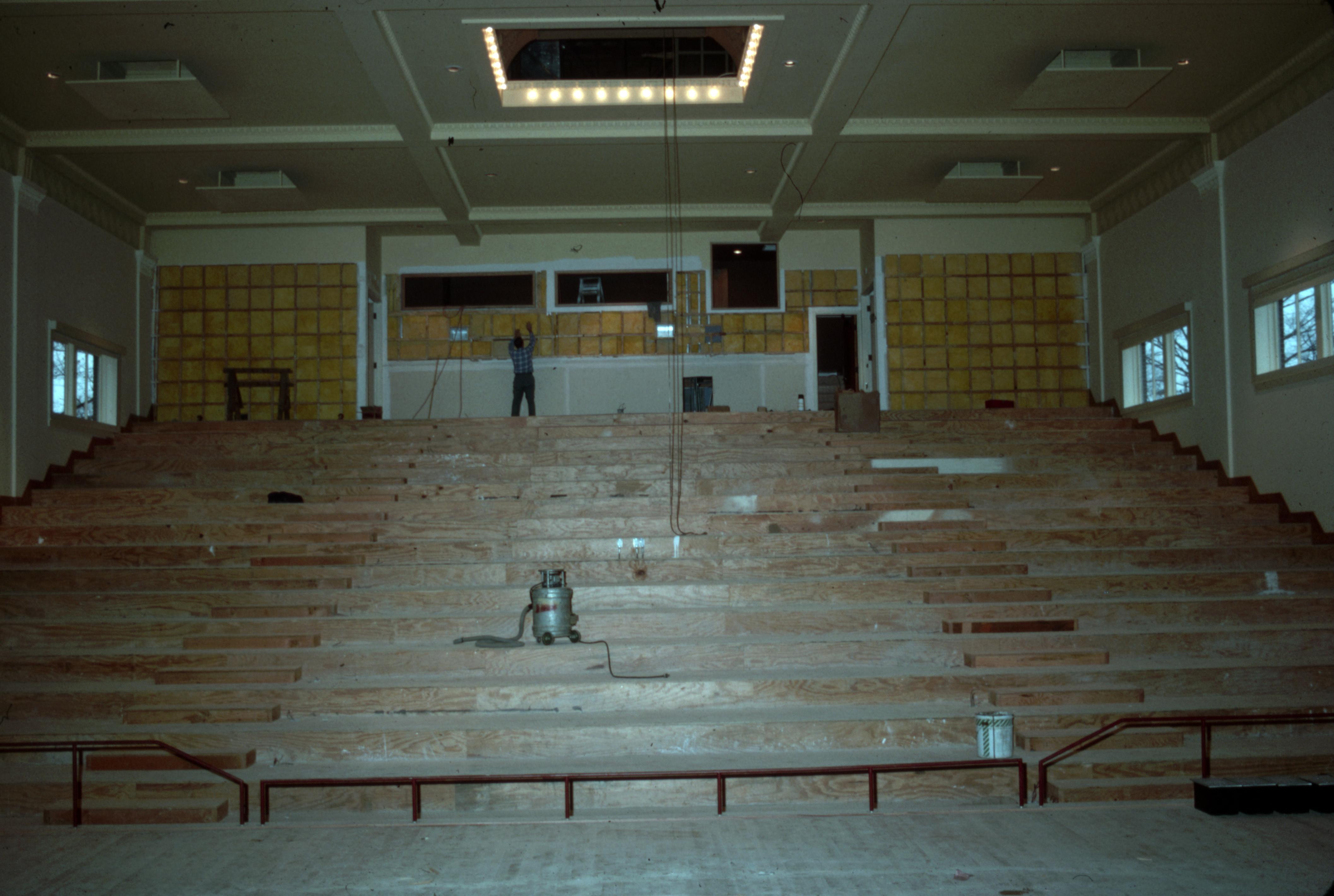 Murphy Auditorium: Murphy Auditorium is located at 419 Tavern Street and was constructed on the plat just east of the Working Men's Institute from 1911 to 1913, using the Doctor Edward Murphy Fund, and was built as part of New Harmony's centennial celebration of 1914. In 2014, the town's bicentennial, Murphy Auditorium became the new home of the concert series Under The Beams, originally housed in the Rapp-Owen Granary. Today, the auditorium is owned by the University of Southern Indiana and is the home of The New Harmony Theater with a seating capacity of 360 people. In this photo the seating area is still under construction.