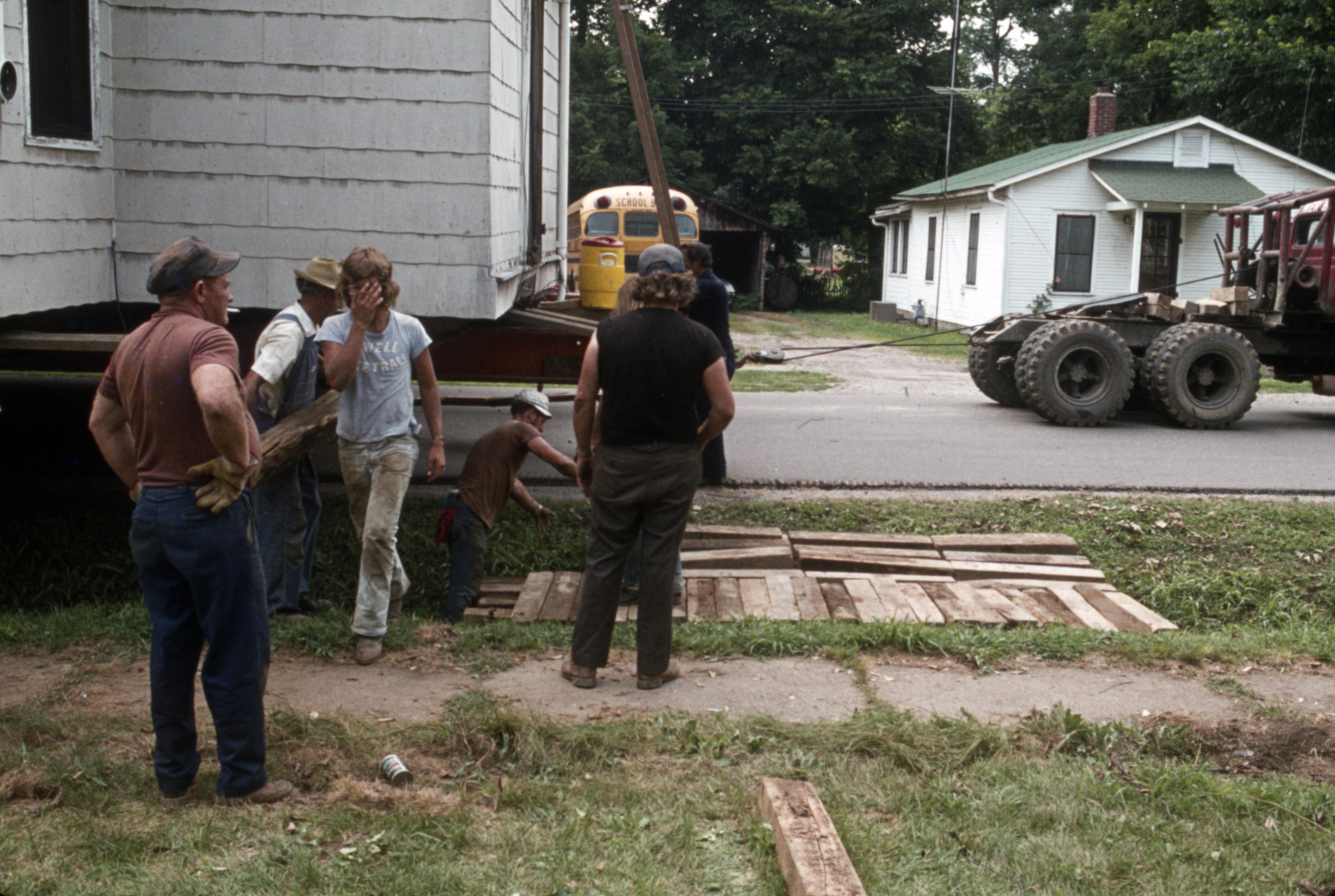 Barrett House Move: This house was originally located at 1826 Main Street but was then moved to 604 South Street during the Lanark Construction. Elmer Buchta were the movers. The ditch along Brewery Street being temporarily being filled with 6 inch x 6 inch timbers to keep the house level as it is taken onto the plat at 604 South Street.