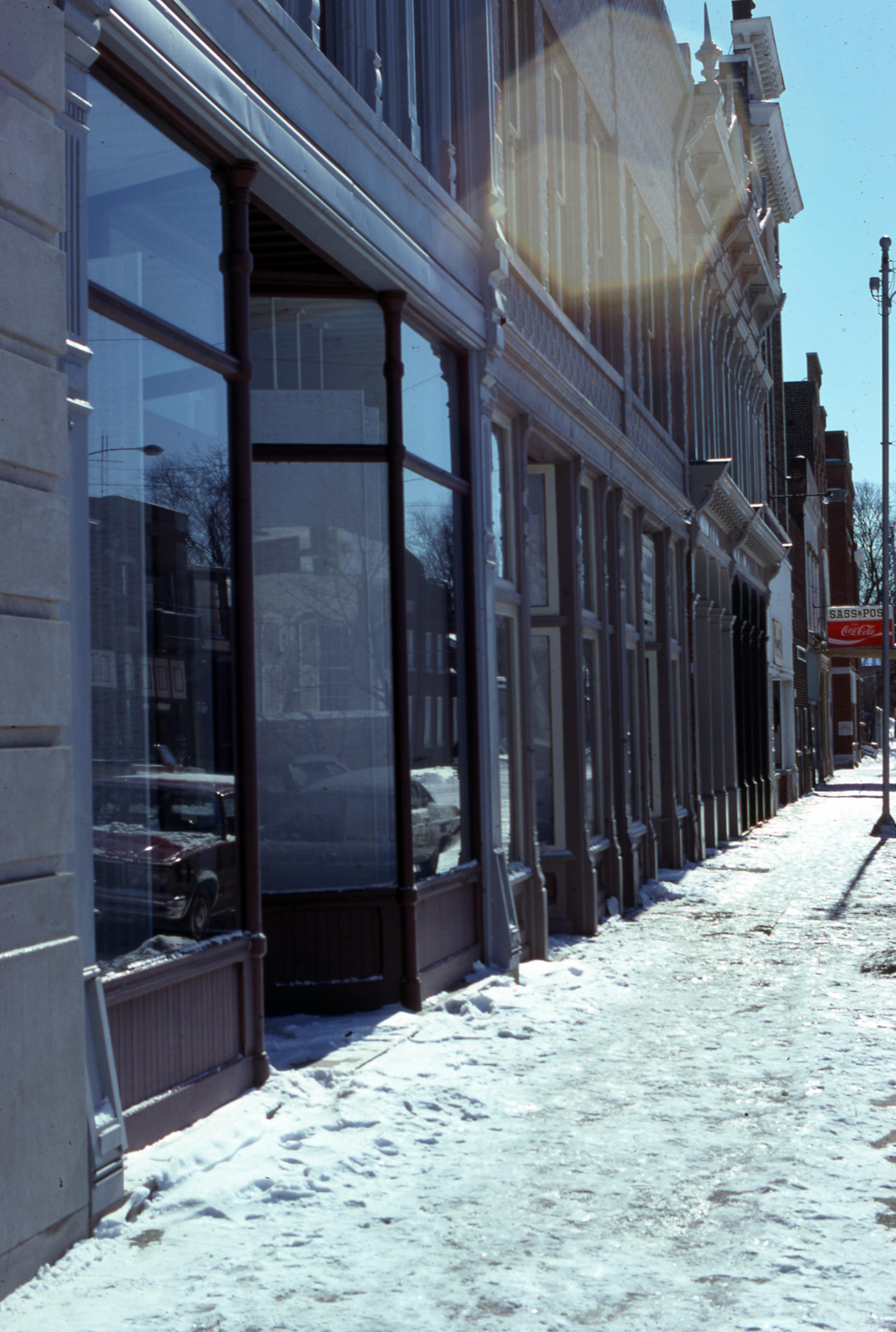 Streets: This is a photo of the businesses along the east side of Main Street, facing south, between Church and Tavern. From left to right: New Harmony Bank & Trust Company which had become the Posey County National Bank, the Privy Shop, the Kopper Kettle Gift Shop, The Main Cafe, Heart of Harmony antiques, Walz Pharmacy, Owen's Variety, The New Harmony Times newspaper, Sass and Poss's tavern, and an antique shop.