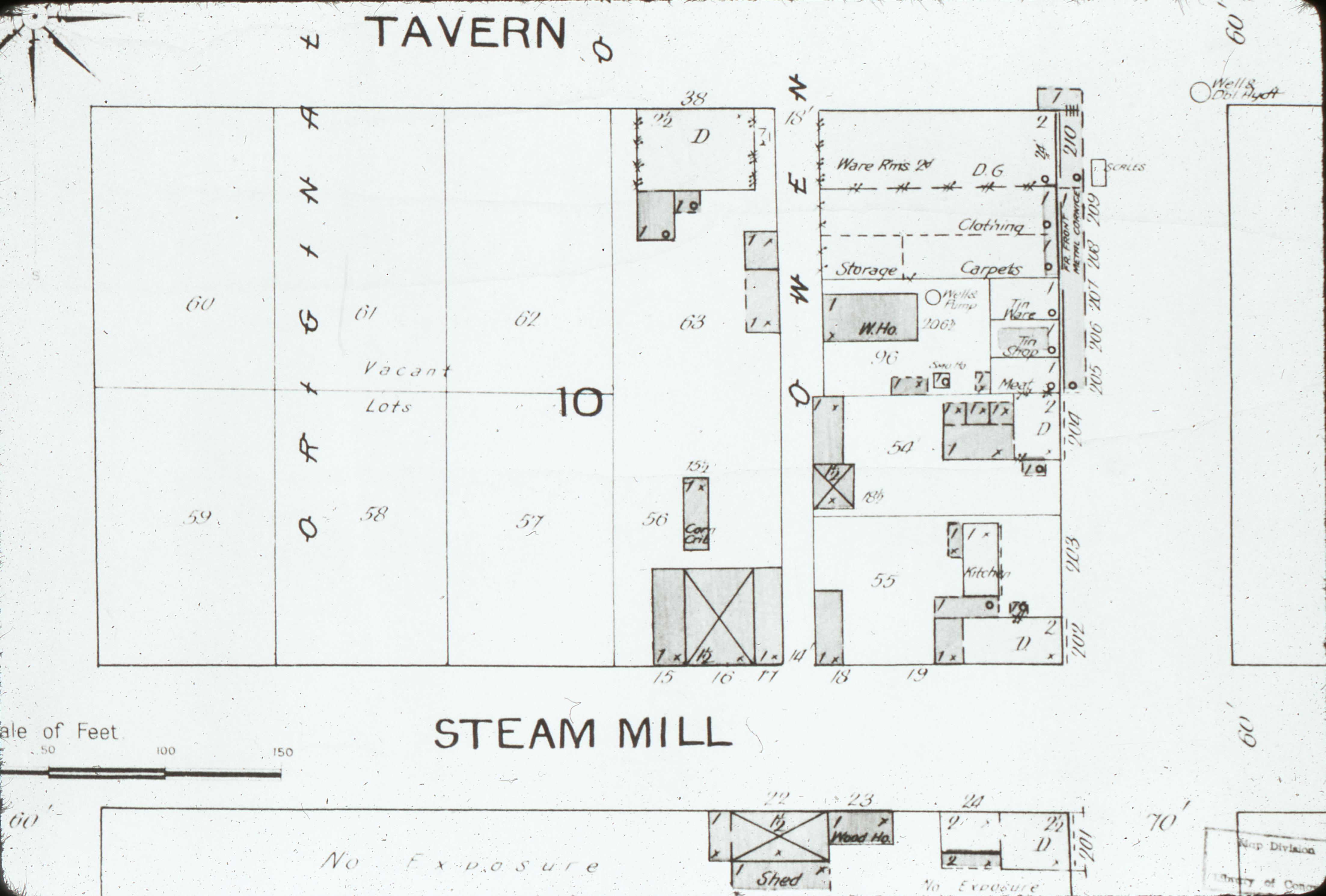 1893 Sanborn Fire Insurance Map: This map was produced by the Sanborn Fire Insurance Company in two sections and is an updated version of the 1888 Map. This map has some detailed information on commercial structures within the town but is a bit limited as the area covered does not include north of North Street, south of Steam Mill Street, west of West Street, or east of East Street. This black and white section is of Town Block 6 - D.