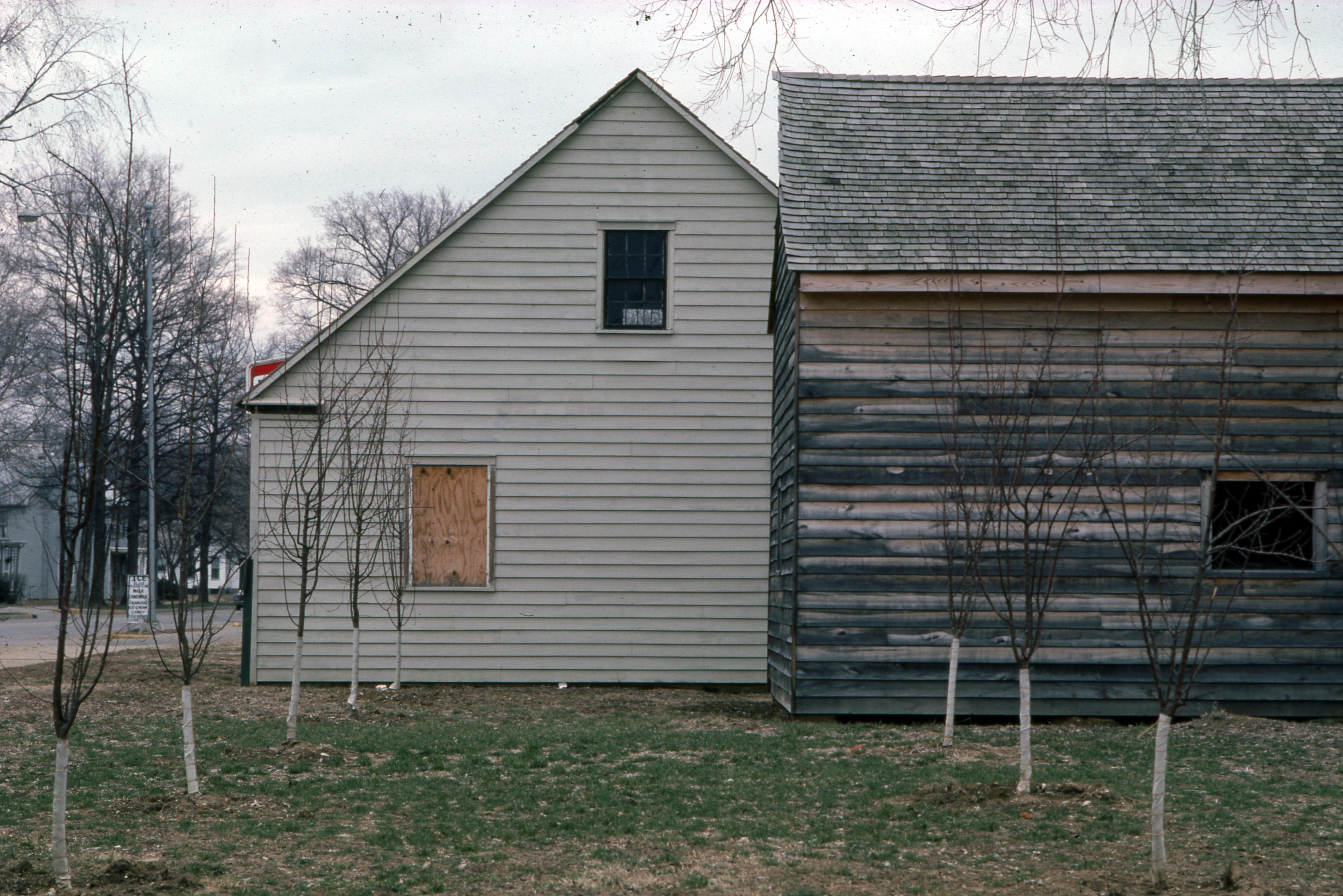 Beal House: The Beal House was moved during the Lanark Construction, on Town Block 8 E/W on Main Street to 611 Church Street. The Beal house was constructed around 1829 by John Beal, who was a carpenter in the Owen and Maclure community. Beal constructed the house from lumber and timbers from an older horse barn. The new location would be the site of the Beal House and 1850s Doctor's Office (The Doctor's Office was a remodel of the Kemmerling House, which was also moved to this site). Elmer Buchta Moving Engineers was contracted for this and many other building moves during the 1970s. This photo shows both the Beal House and the Kemmerling House in place on the new plat on Church Street before restoration and remodeling were completed.