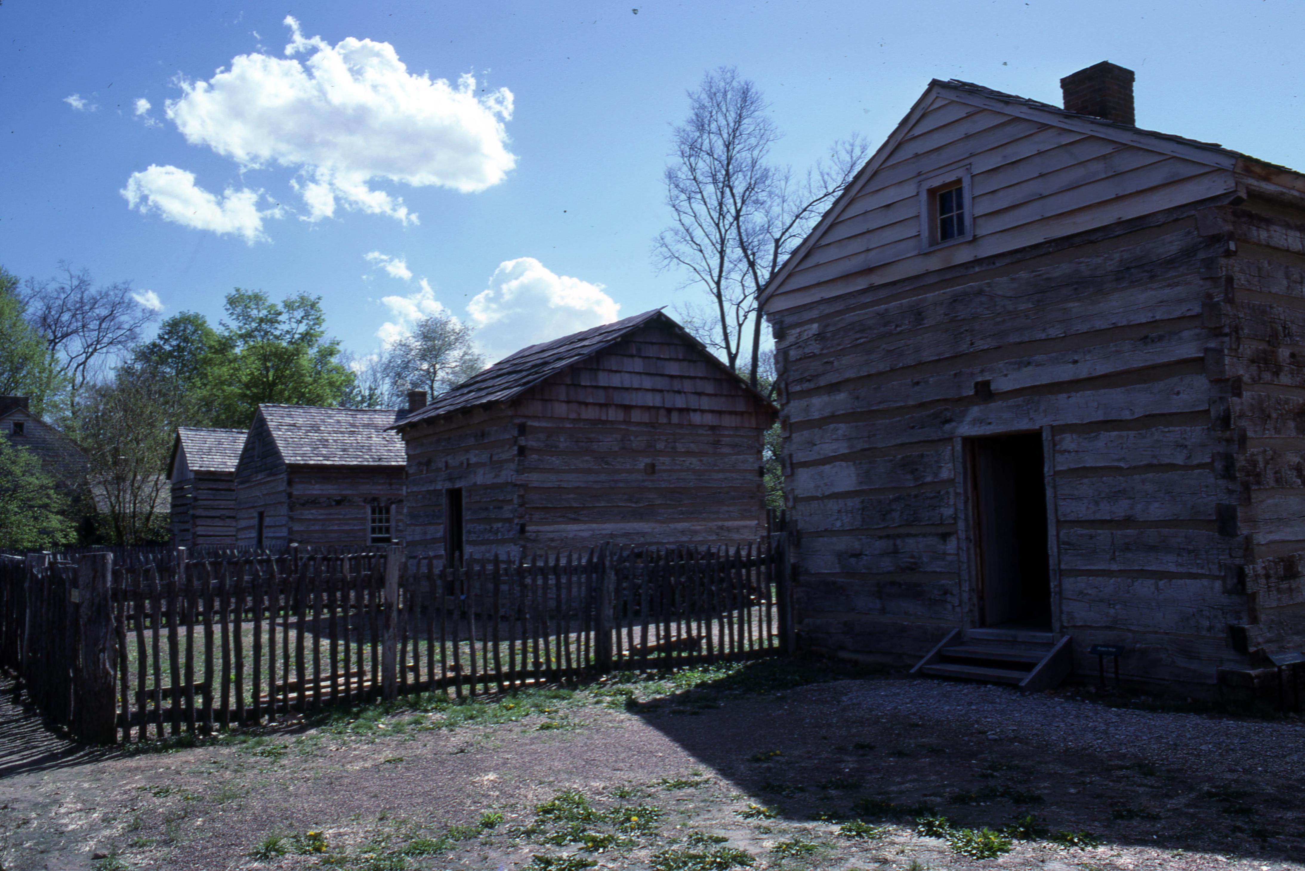 The West Street Log Cabins located at 301 West Street, New Harmony, Indiana. The logs that were used to reconstruct the West Street Log cabins came from the John Spencer log house in Crossville, Illinois.