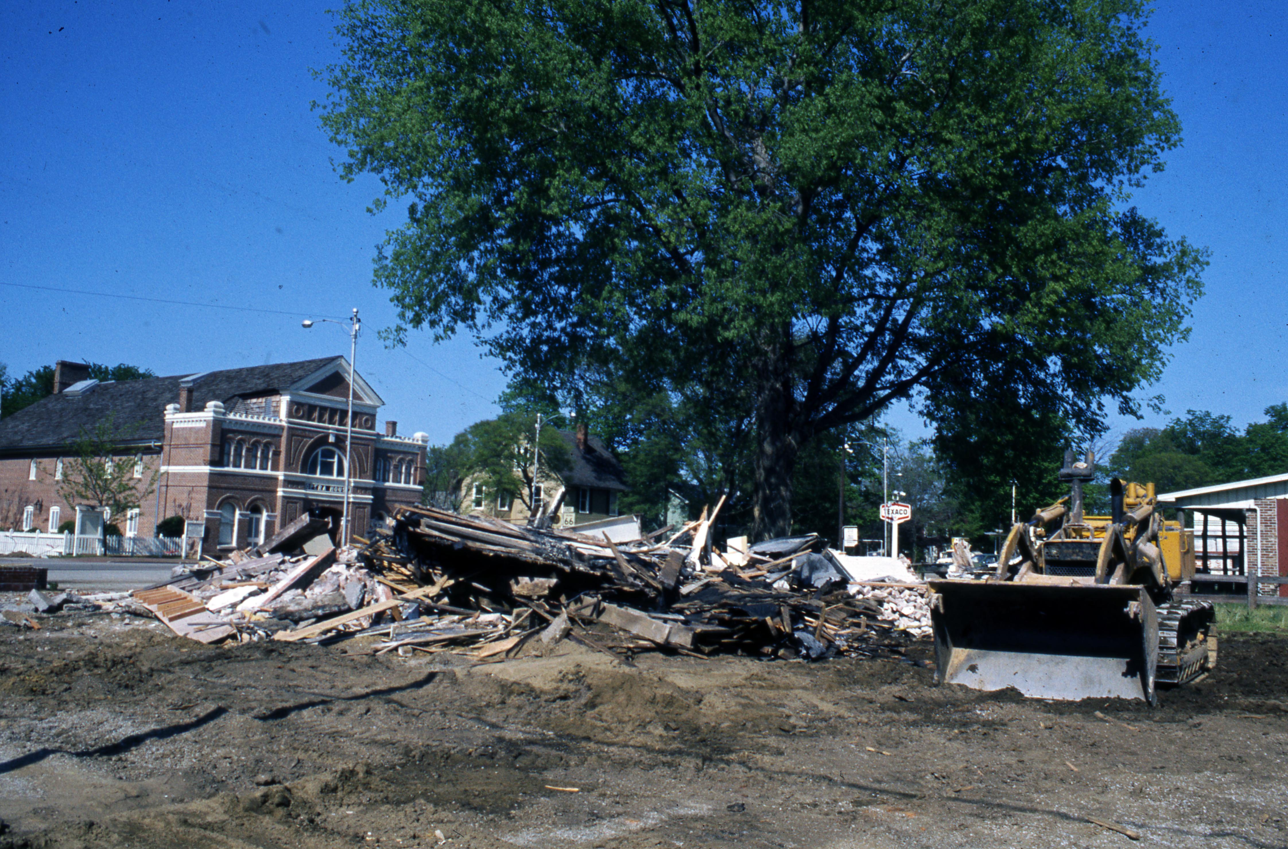 1943 Filling Station: This old gas station was located on the corner of Brewery and Church Streets. It was demolished to make room for the Beal House and Kemmerling House moves. In this photo the building is a pile of rubble in the foreground. Across Church Street is Thrall's Opera House.