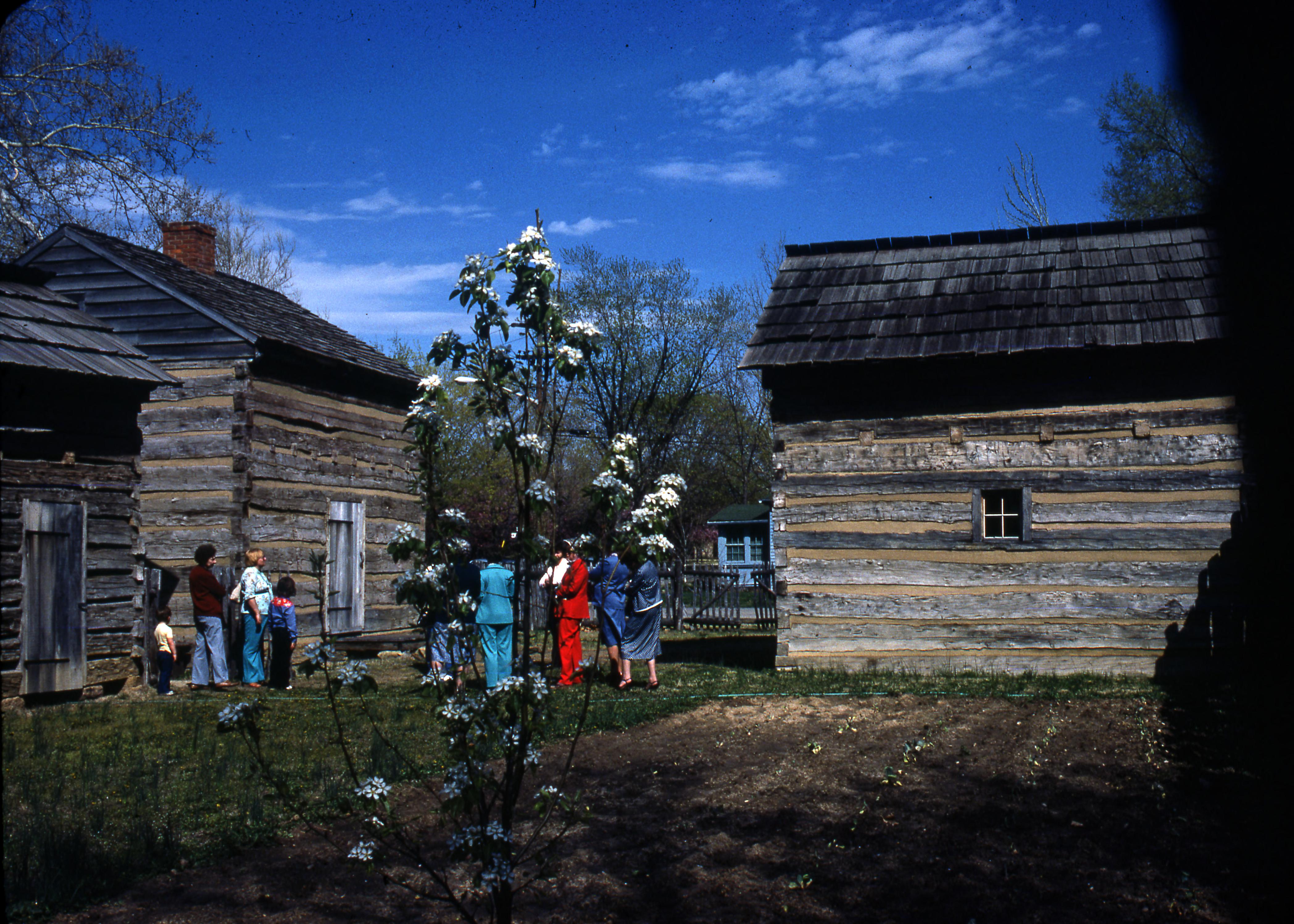 The West Street Log Cabins located at 301 West Street, New Harmony, Indiana. The logs that were used to reconstruct the West Street Log cabins came from the John Spencer log house in Crossville, Illinois.