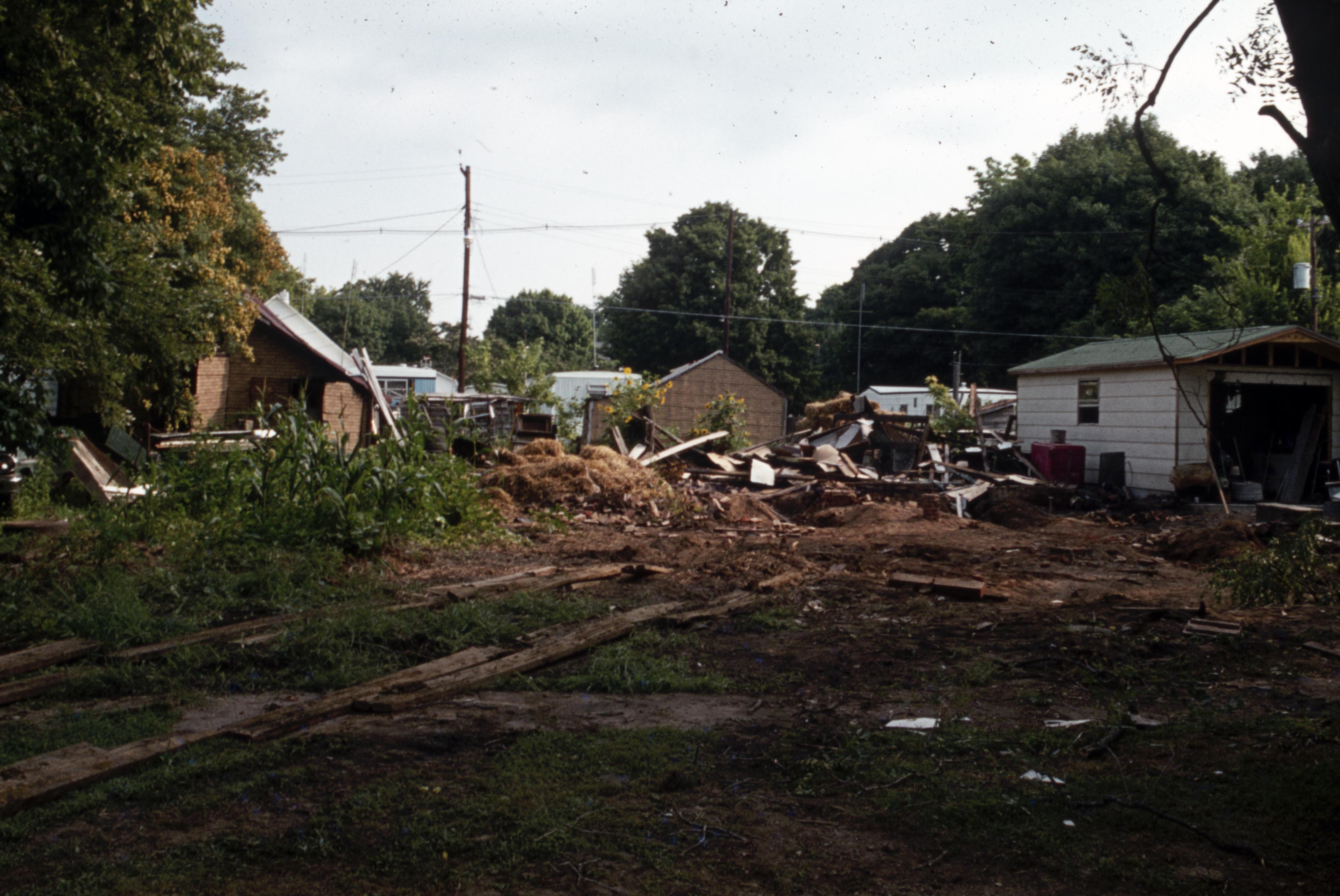 Fredrick Street Constructions Collection: Rubble left behind from the Cooper House move originally on this plat. The brown garage on the far left of the photo caught fire, was burned, and then demolished.