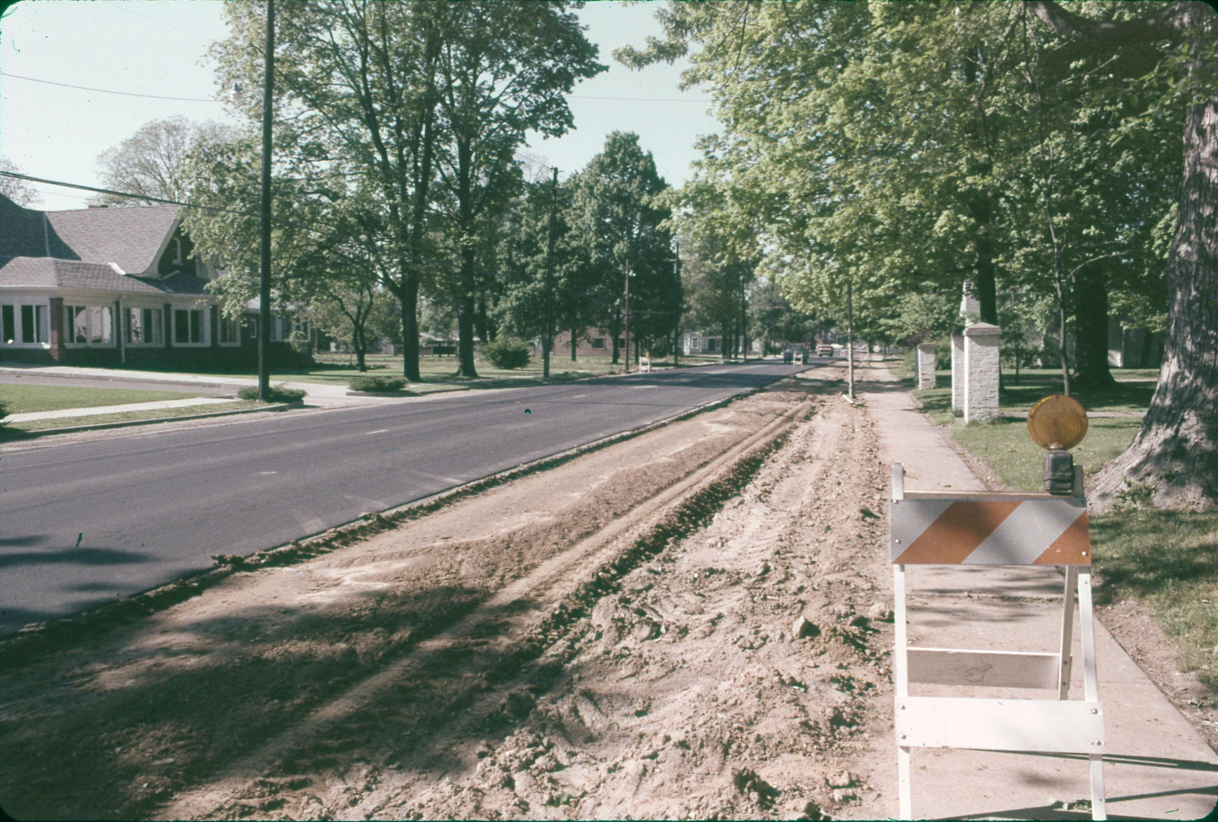 Streets Collection: Main Street. This photo was taken on Main Street facing south. The Charles Ford Memorial Home can be seen on the left side of the photo. The brick/stone fencing (probably for wrought iron) posts for the property at 831 Main Street can be seen on the right. Both The Charles Ford Memorial Home and 831 Main Street are still present as of 2020.