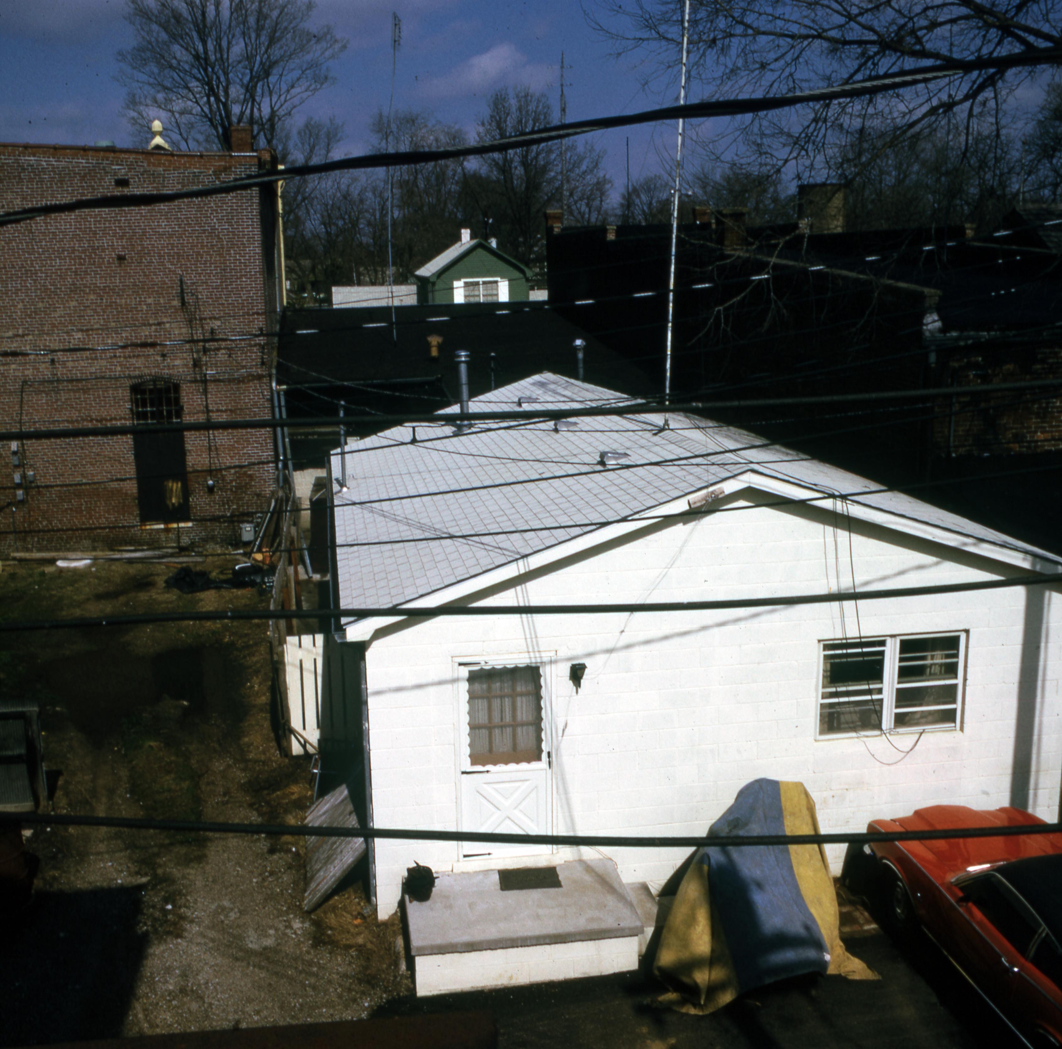 Back plats: This is a photo of the plats behind the buildings on the northwest corner of Town Block 5 E. A cinderblock (concrete block) building, which was used as a home, was moved from this plat location. This is a photo of the Cinderblock building which was moved from the plat.