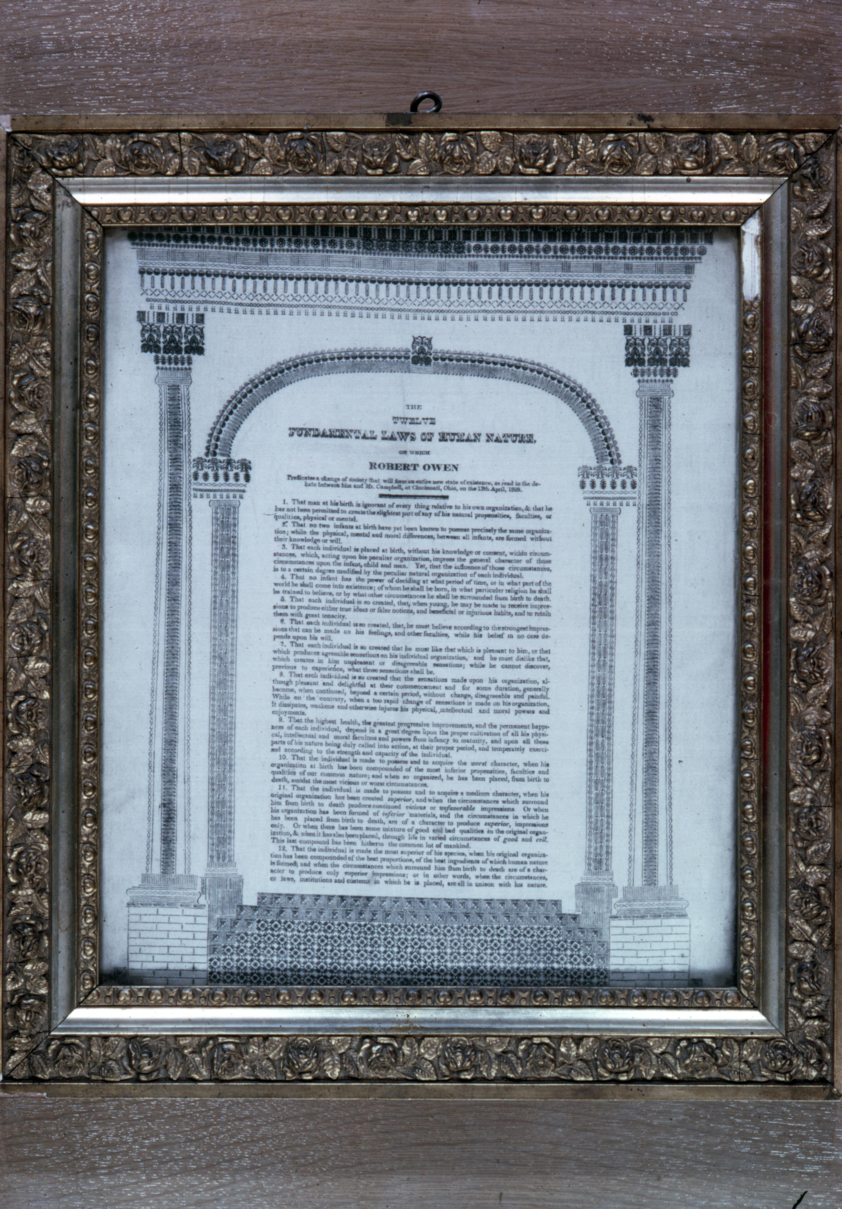 Working Men's Institute: This building is located 407 Tavern Street. The Working Men's Institute was founded in 1838, by William Maclure, as a library for working people, not just those who were wealthy. Initially there were a total of 160 Working Men's Institutes, 144 in the state of Indiana and 16 in the state of Illinois, however, the one in New Harmony Indiana is the only one which still remains. The present location of the WMI was completed in 1894, now a National Historic Landmark, before this it was housed in the old Harmonist Church from 1834 until the new building was completed. The WMI also houses a museum as well as the oldest working library in the state of Indiana. This is a print of The Twelve Fundamental Laws of Human Nature written by Robert Owen, which can be seen at the WMI.