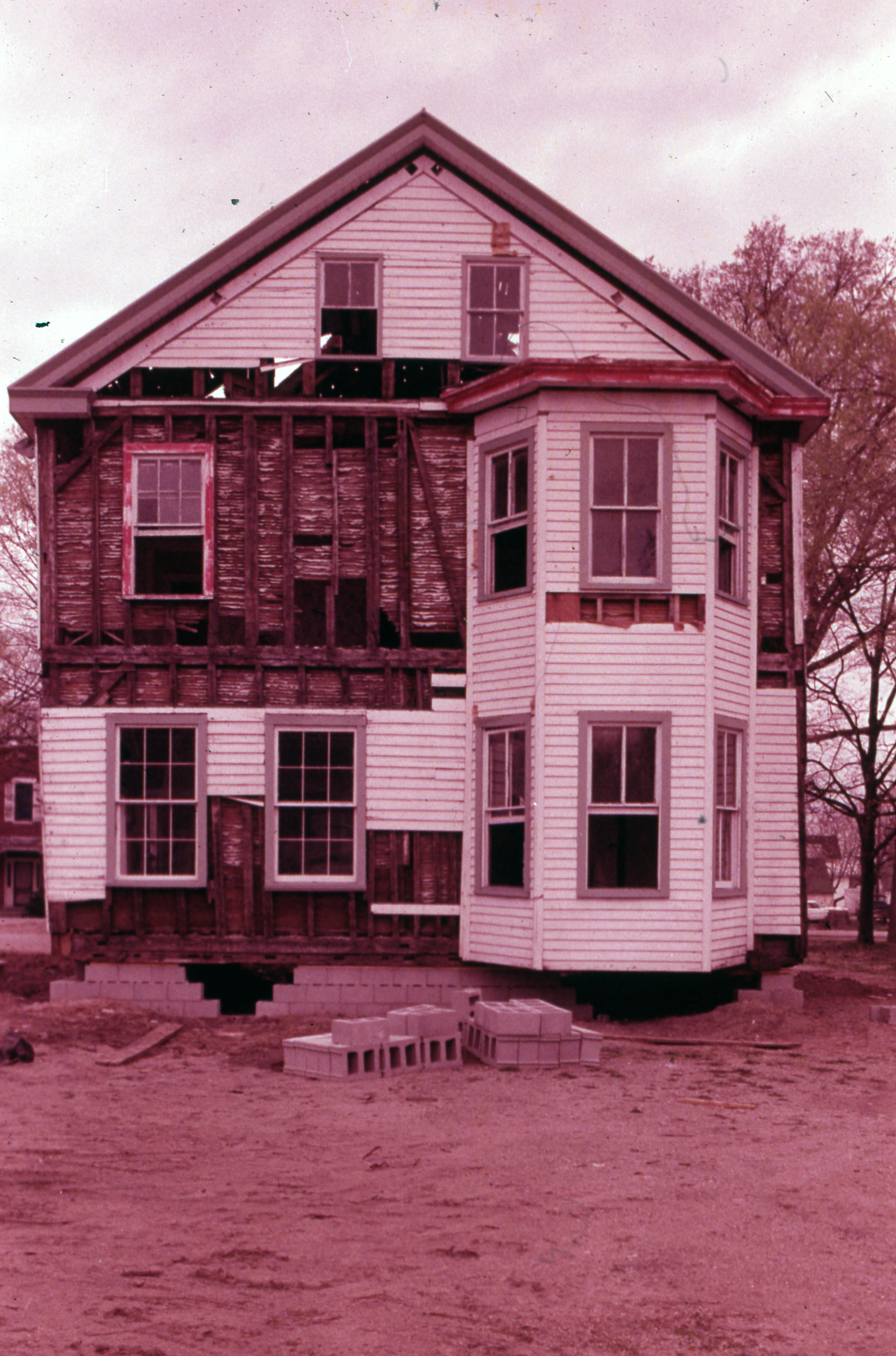 Golden House: This building was moved from the plat of 807 Church, what is now 811 Church Street, to one plat west of 723 E. Church Street but has since been demolished, most likely when the house at 707 E. Church was built in 2009. Elmer Buchta Moving Engineers was contracted for this and many other building moves during the 1970s. This photo shows the house in place at the new location before remodeling. This became the north side of the house which faced Church Street.